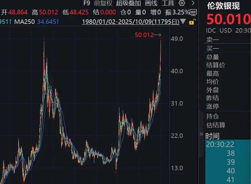 现货白银价格直线拉升,历史首次突破50美元/盎司,涨幅超4%。今年已累计上涨逾70%。此前,现货白银于2011年4月创造高点49.79美元/盎司。现货黄金转为上涨,截至发稿,涨0.32%,报4054.22美元/盎司。