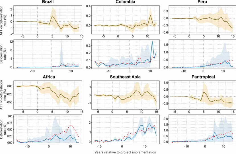 研究结果表明,近三分之一的项目单元(21/66)在实施REDD+项目后,森林实际损失面积显著低于基线损失面积,特别是位于巴西的项目,表明相关项目具有潜在的气候效益。然而,仅19%的项目(10/52)实现了项目开发方申报的毁林减少面积,约35%的项目(18/52)申报值超出实际估算10倍以上,其中哥伦比亚尤为突出,表明REDD+项目的气候效益存在系统性高估。就区域尺度而言,巴西、非洲和整个研究的泛热带地区在实施REDD+以来,毁林率呈显著的总体下降趋势,而哥伦比亚、秘鲁和东南亚则不具显著性。