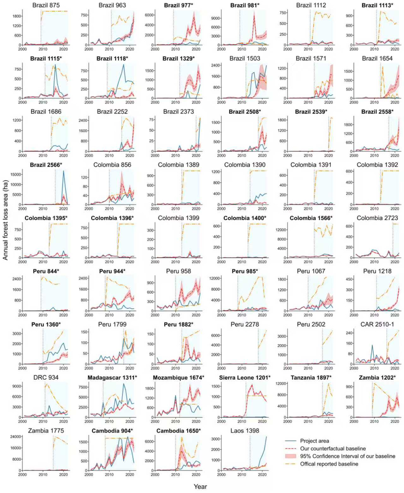 自愿REDD+项目碳信用核算的难点在于依赖基线情景——即假设无项目干预时的森林损失情景,为项目减排量核算提供参考基准。由于基线无法直接观测,成为方法学的关键挑战。传统REDD+基线测算被指存在透明度不足、毁林风险夸大、碳信用超额发放等问题,气候效益广受质疑。最新研究表明,仅6.1%的热带森林保护碳信用具有真实减排效果,严重削弱市场信任。为了准确评估REDD+项目的气候效益,恢复市场信心,亟需更透明、稳健的基线评估方法。