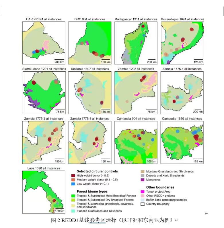 面对这一挑战,清泉院士带领深圳大学和光明实验室团队开展攻关研究,评估了迄今为止最大规模的自愿REDD+项目的真实气候效益(涵盖12个热带国家共计52个自愿REDD+项目(66个项目单元))。团队基于多种合成控制法、多源遥感地理大数据和多轮随机实验,综合考虑各类时变毁林风险因子和时空特征匹配算法,发展了一套透明可靠的自愿性REDD+项目动态基线构建方法,实现了项目和区域尺度上的REDD+项目的气候效益的准确量化。该方法通过在项目区周边不受保护的地带,严格匹配与项目区实施REDD+前地理空间特征和历史森林砍伐动态一致的地块得到基线参考区(控制区),基线参考区的森林变化动态可认为是项目区未实施REDD+的基线情景。该方法生成的动态基线能够融合外部环境变化,有效克服传统静态基线无法反映毁林驱动因子动态变化的缺陷。同时,基线毁林面积可通过卫星影像监测得到,使计算更透明、验证更便捷,且不易被人为干预。