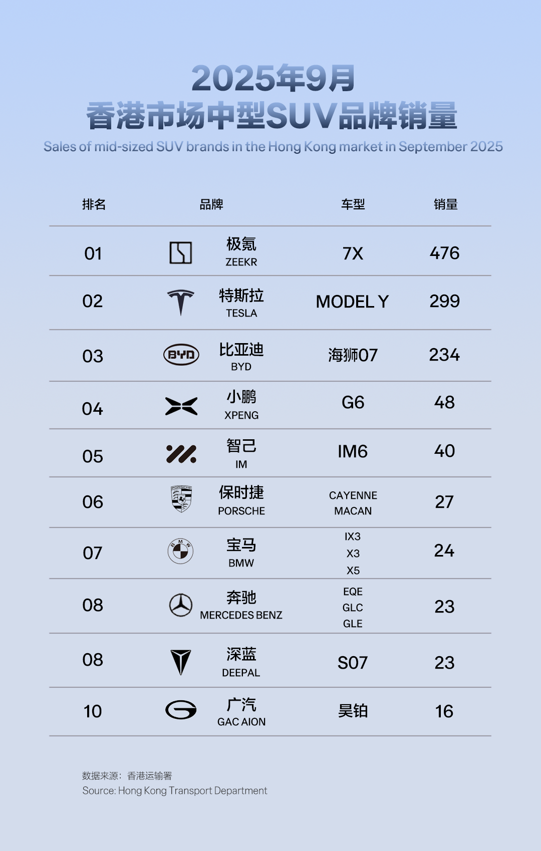 10月10日,记者获悉,近日香港运输署公开数据显示,极氪旗下豪华大五座SUV极氪7X,在过去的9月,超越特斯拉Model Y车型,夺得中型SUV销量冠军。据悉,这是极氪7X在中国香港经历的首个完整交付月。
