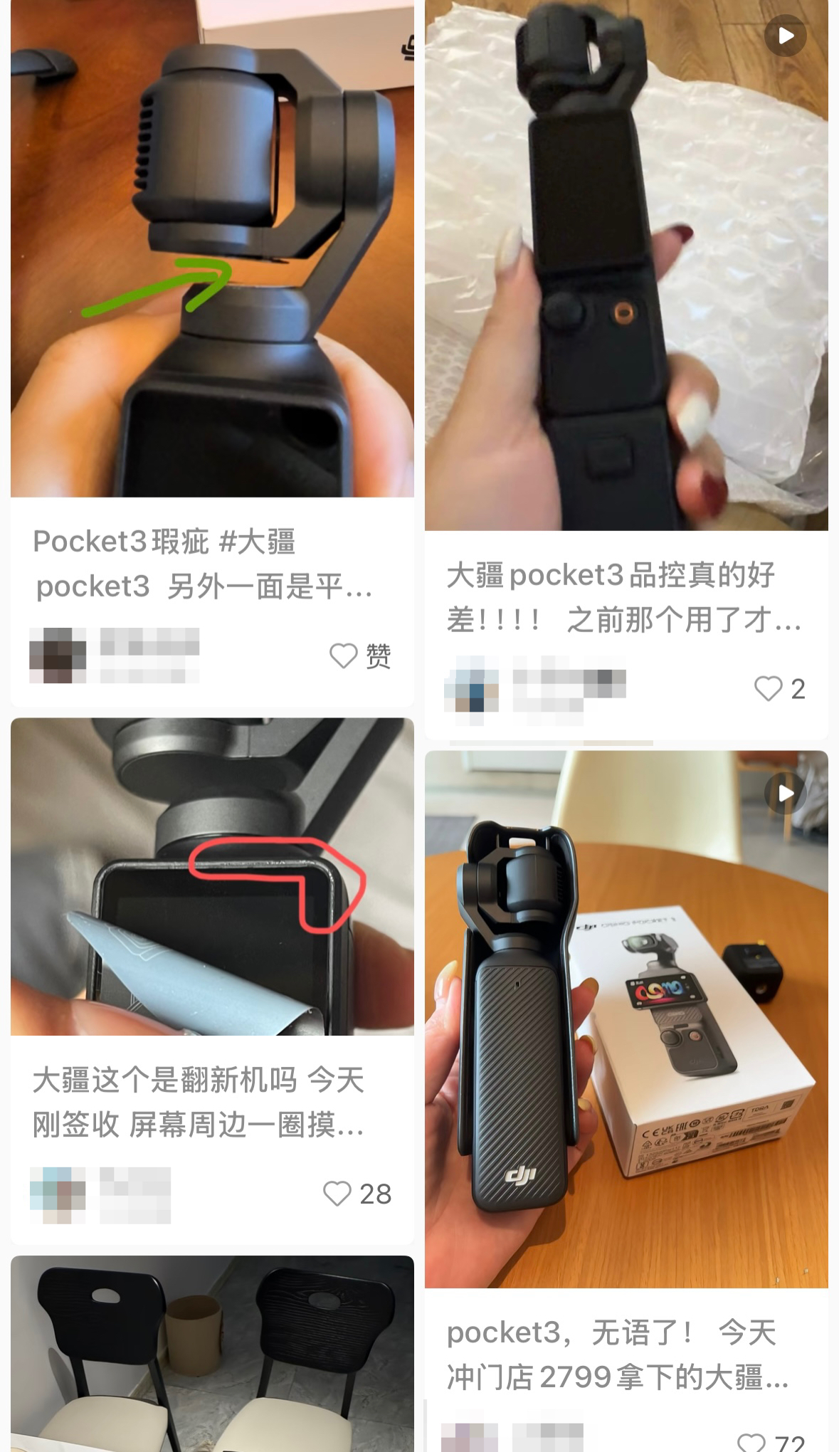 10月9日,大疆正式启动“双十一”促销,包括明星产品Osmo Pocket 3在内的多款产品降价,部分机型降幅超千元。10月10日,有不少消费者在社交平台发文称,在活动期间购买Pocket 3,收到的机器表面有划痕、掉漆等瑕疵。