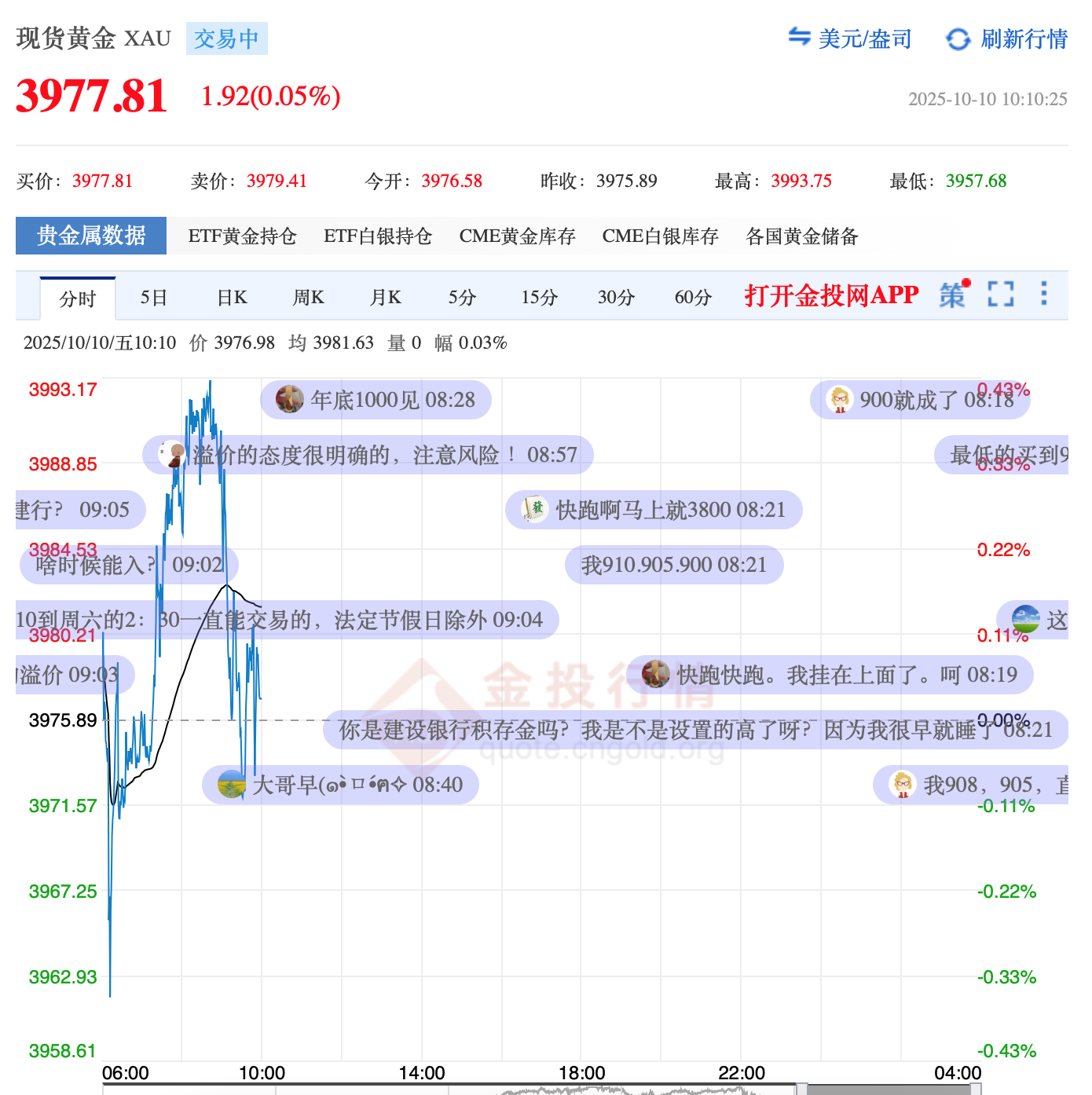 在10月8日冲上历史高位之后,黄金价格出现了回调。10月9日,现货黄金价格报收3975.89美元/盎司,下跌1.58%。而10月10日,截止记者发稿,现货黄金价格报于3965.49美元/盎司,日内跌幅0.26%。此前这一价格当天持续在3970美元/盎司左右徘徊,最高上探3993.75美元/盎司,最低触及3946.29美元/盎司。
