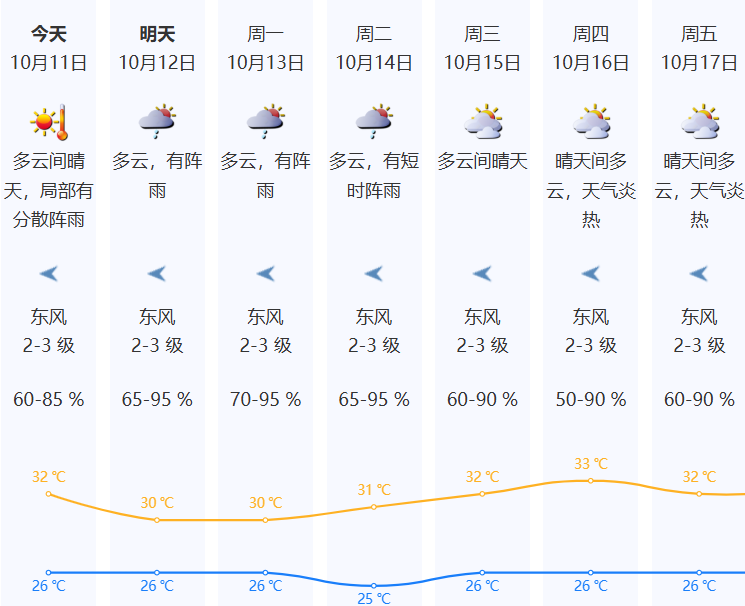 预计10月11日,深圳多云间晴天,局部有分散阵雨;气温26-32℃,中北部和人口密集区最高气温35℃左右;偏东风2-3级,沿海、高地和海区阵风5-6级。