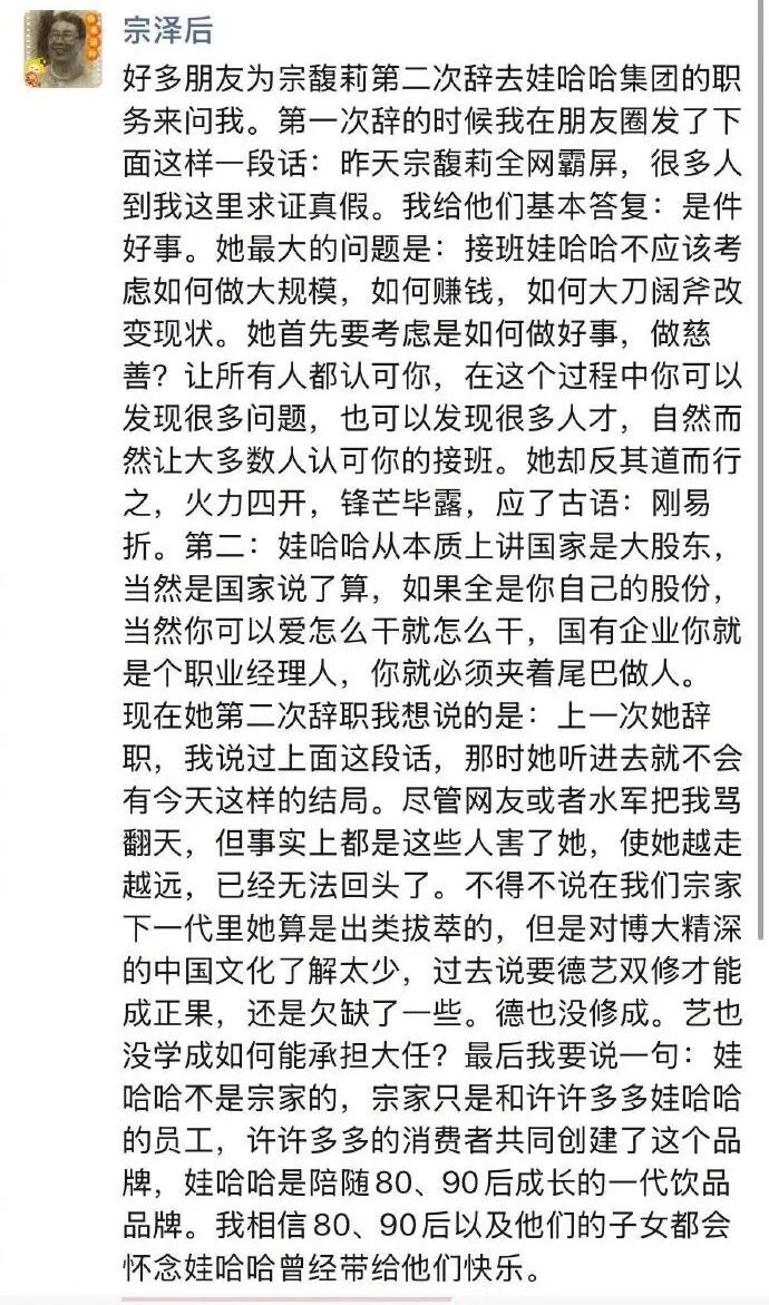 10月11日,宗泽后在朋友圈再次发声。对宗馥莉第二次辞职,宗泽后表示,上一次宗馥莉辞职时自己发表言论,被网友或者水军骂翻天,但事实上都是这些人害了她,使她越走越远,已经无法回头了。