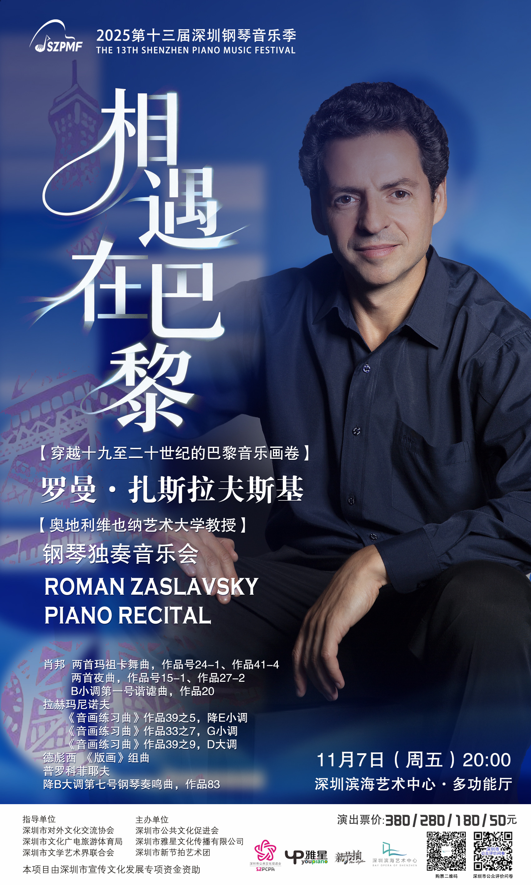 11月7日晚,国际著名钢琴家罗曼·扎斯拉夫斯基将在深圳滨海艺术中心献上“相遇在巴黎”钢琴独奏音乐会。作为2025第十三届深圳钢琴音乐季的亮点之一,本场音乐会是这位钢琴家的首次受邀亮相。现场,他将通过独特的曲目策划,重现四位音乐巨匠在巴黎这座艺术之都留下的不朽乐章。