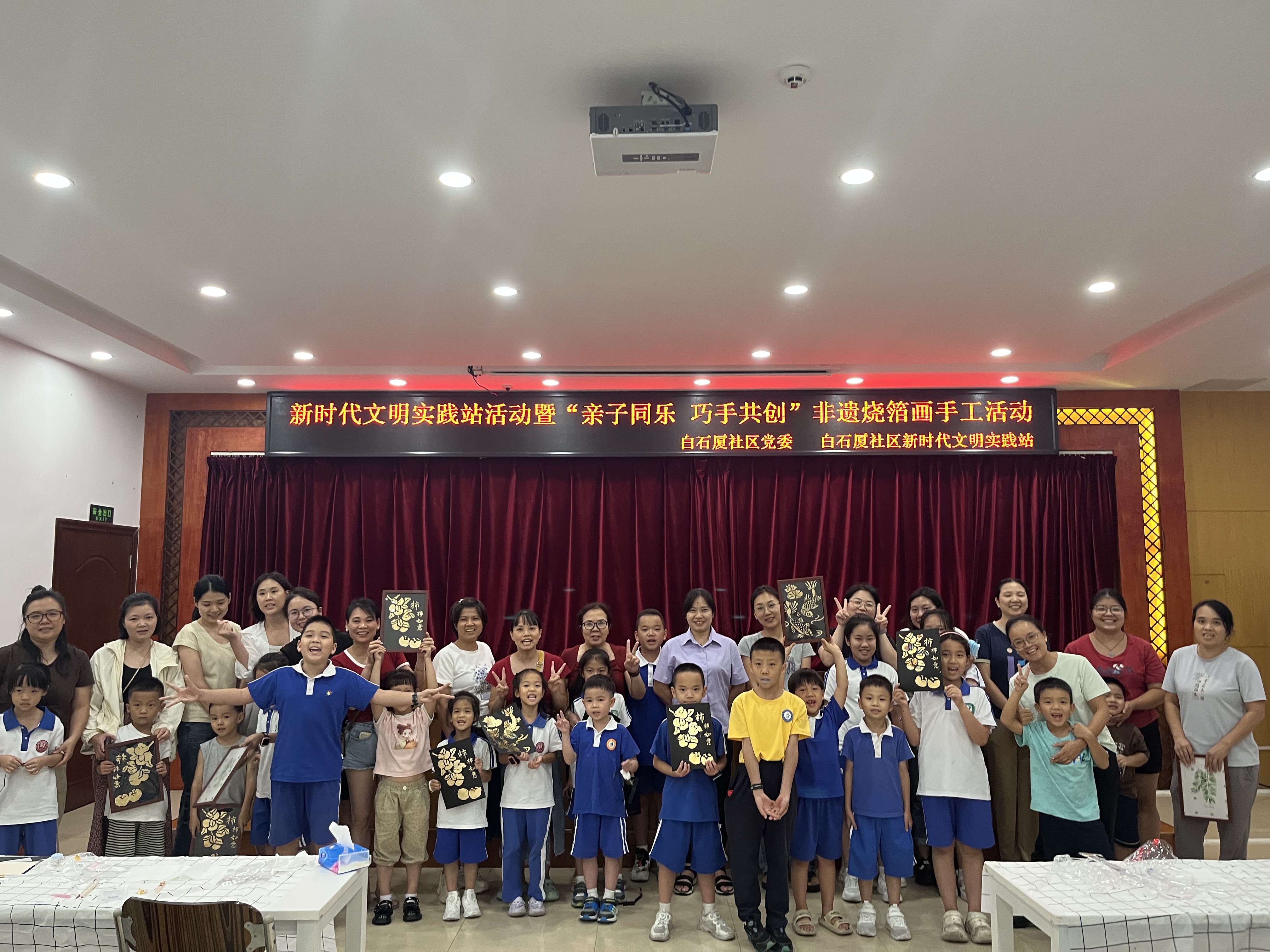 10月9日晚,福永街道白石厦新时代文明实践站举办了“亲子同乐 巧手共创”非遗烧箔画手工活动。在专业工艺师的指导下,辖区20余对亲子家庭沉浸式体验了这项拥有上千年历史的国家级非遗技艺。
