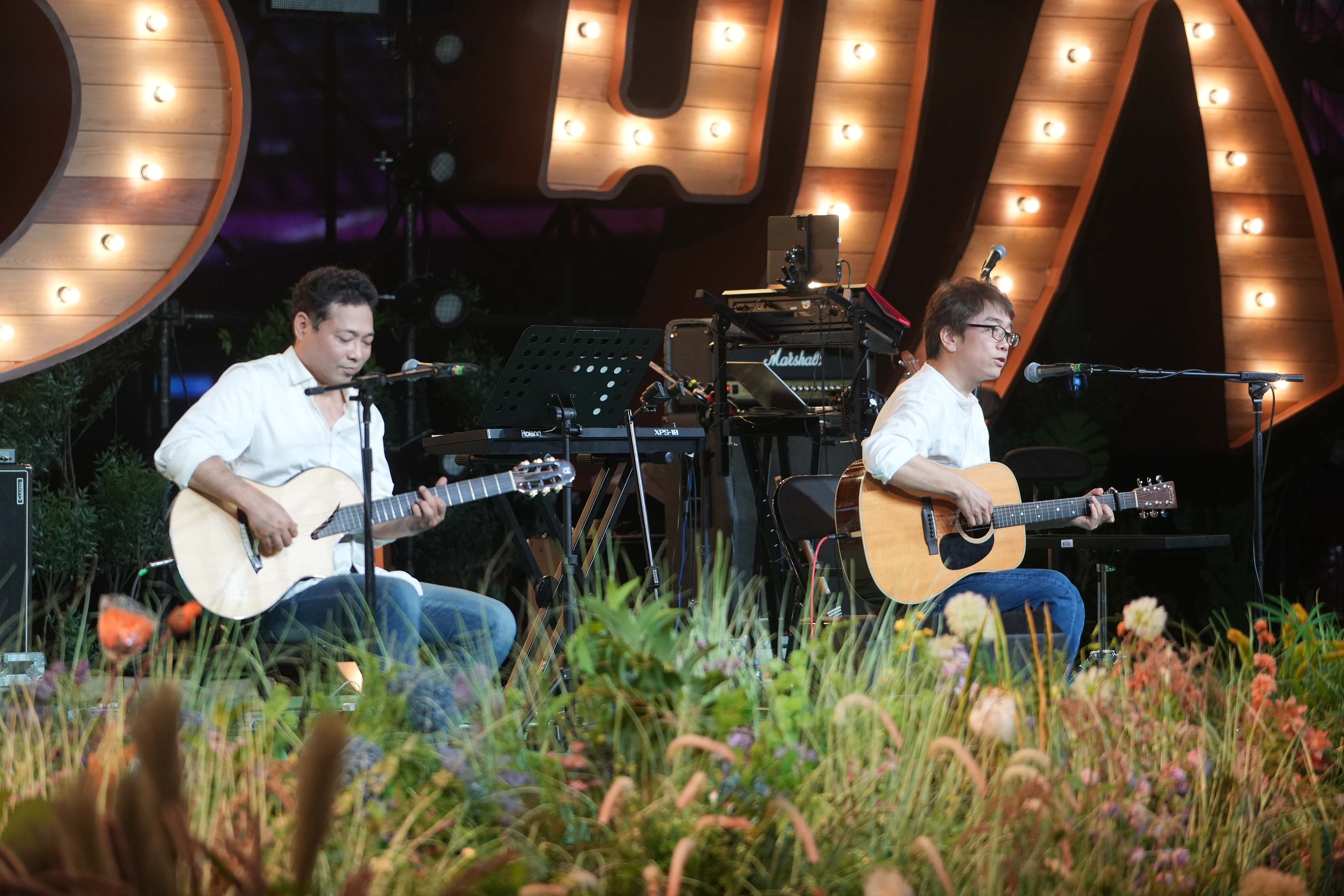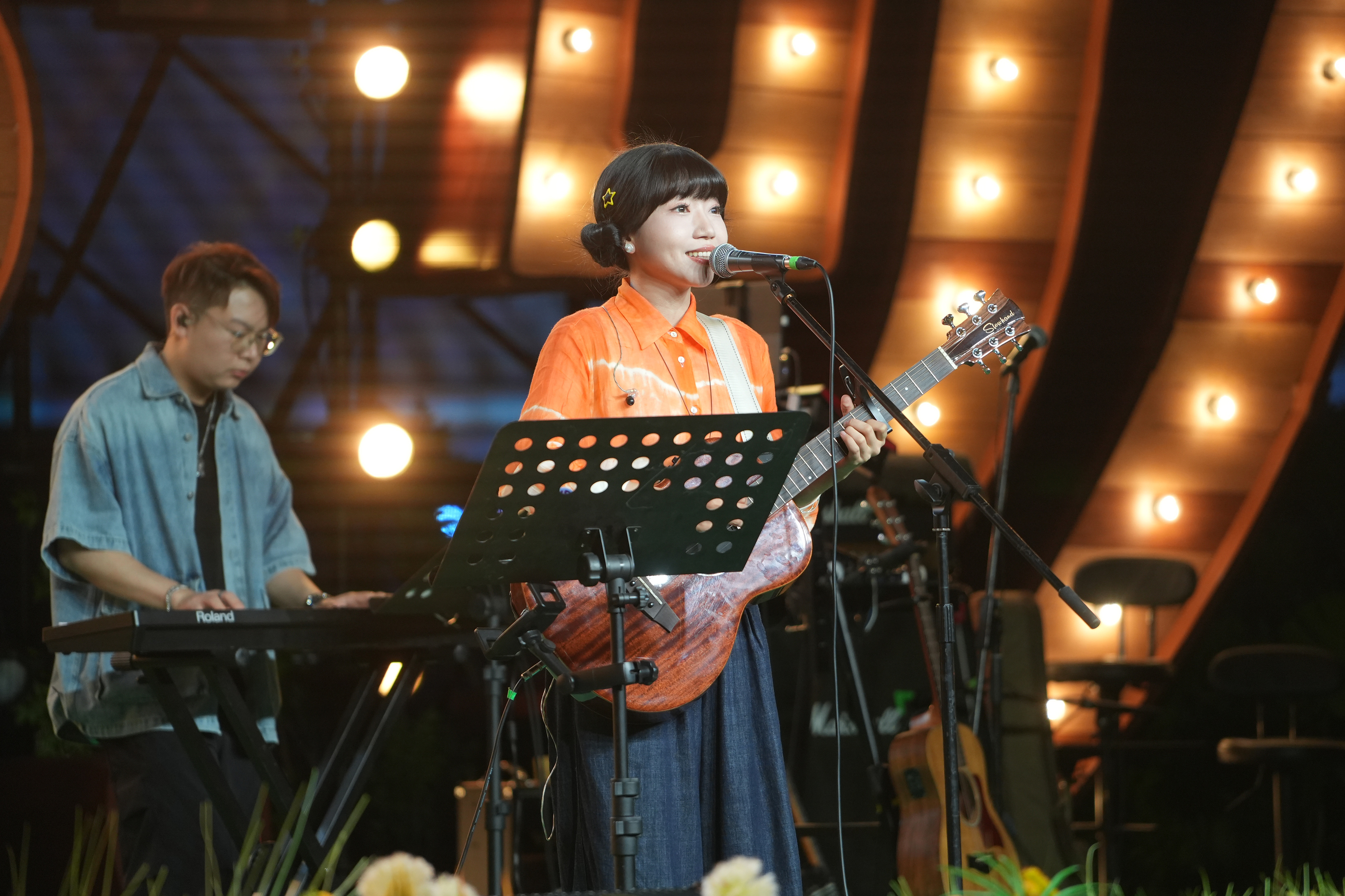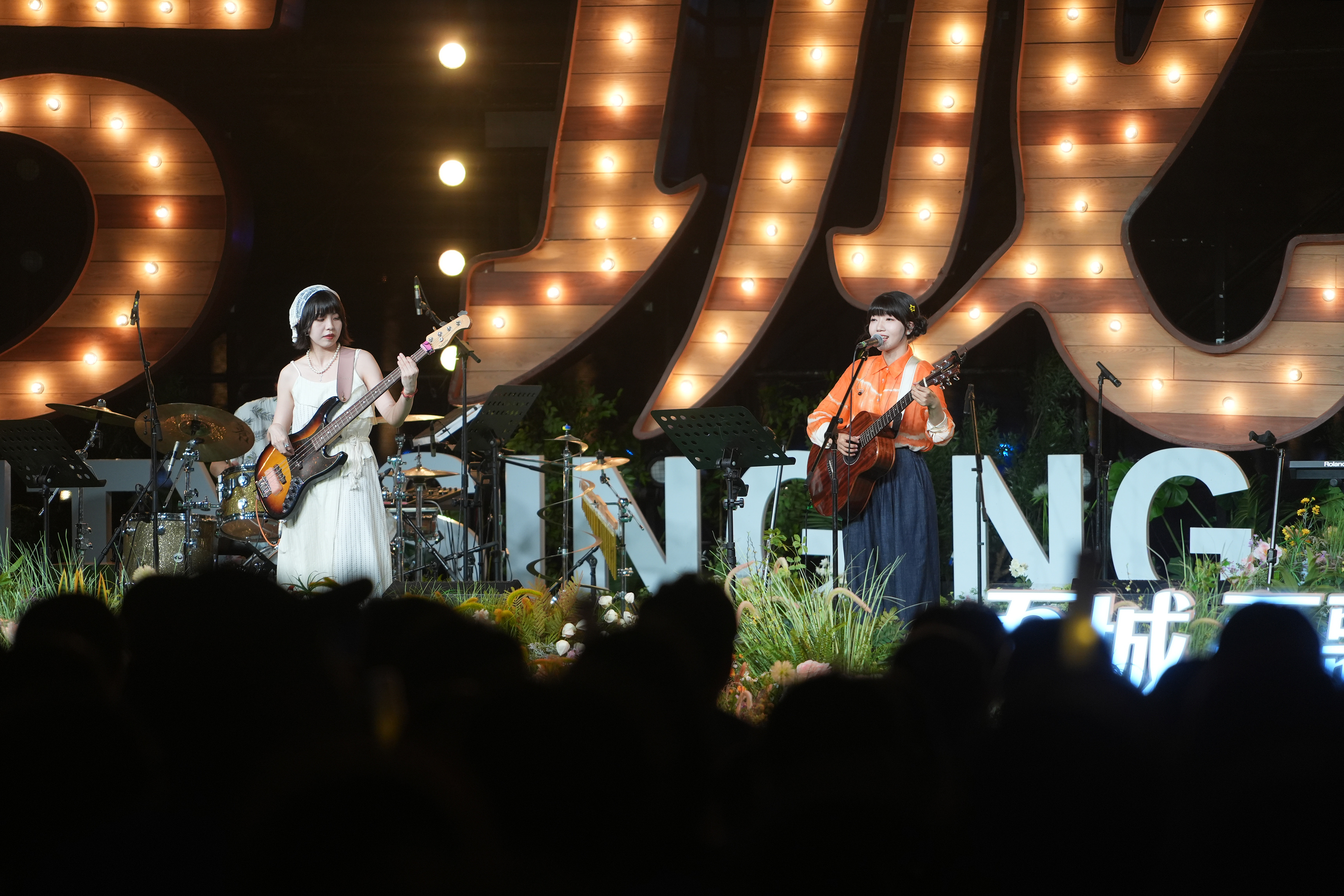 当暮色四合,晚风轻拂深圳湾,欢乐港湾庆典广场灯光璀璨。本场演出在张过年的深情哼唱中拉开帷幕,他温暖清澈的嗓音,缓缓流淌进夜色之中。来自北京的张过年,是一位在旋律中叙事的歌者。他的音乐旅程是一场蜕变——早年深耕电子音乐,编曲精细繁复;三十岁后转向民谣,毅然剥去所有修饰,以最简单的三和弦,写出最动人的旋律。当晚的演出中,他只凭两把吉他,相继演绎了《酩酊河》《劫后余生》《深夜的歌》《世界》等作品。移动车厢、胡同口的饭店、图书馆、公园、列车、超市……这些日常生活的片段,在他的笔与歌中,被淬炼成浪漫的诗意。简单如水的吉他和弦,包裹的诗意在曲中奔流;一把吉他,亦足以唱出隽永。