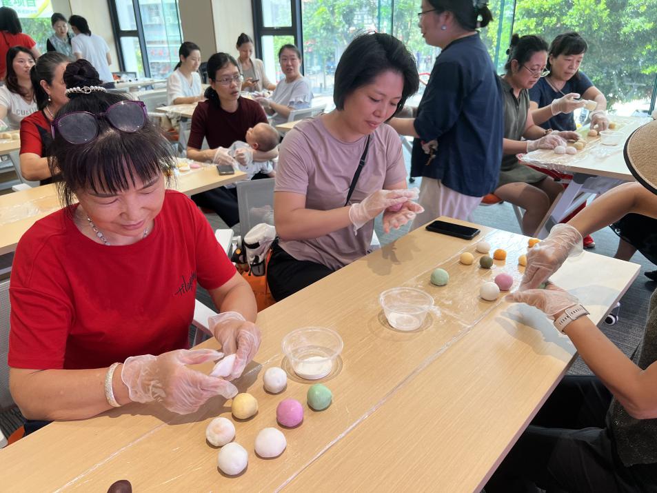 9月28日,新洲社区党群服务中心飘出阵阵“甜蜜气息”——冰皮月饼手工活动在这里温馨开展。居民们戴上手套,跟着老师的示范,将软糯的饼皮包裹住香甜的馅料,再用模具轻轻一压,“花好月圆”“家国团圆”等吉祥图案便清晰印在月饼上。“自己做的月饼,吃起来更有中秋味儿!” 参与活动的张阿姨笑着展示成果。现场弥漫着甜蜜与欢笑。