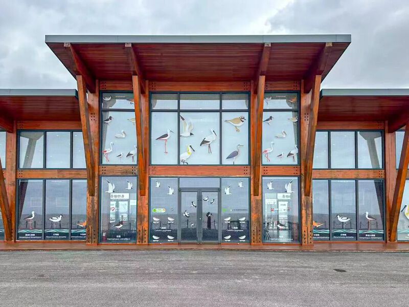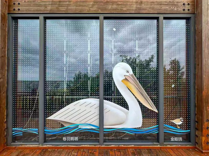 目前,条子泥湿地四号驿站已完成改造措施,来自北京林业大学等专家共同参与了防鸟撞贴纸的设计工作。团队从条子泥湿地选取了几种具有代表性、且体型各异的水鸟,以趣味“排排站”的方式完成视觉设计,在有效防范鸟撞的同时,也实现了科普教育与空间美化的双重功能。