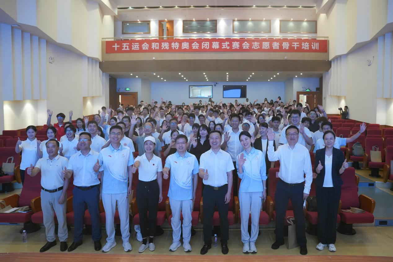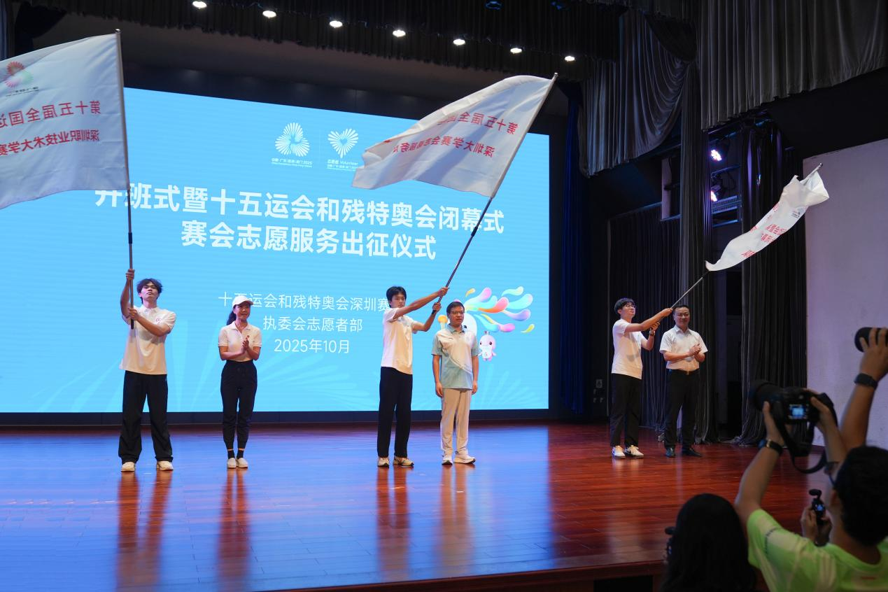 十五运会和残特奥会赛会志愿者统称为“小海豚”。这一昵称寓意志愿者如海洋精灵般亲切友善、团结奋进,能以热情周到的服务为赛事护航。在出征仪式上,十五运会和残特奥会深圳赛区执委会、深圳大学、深圳职业技术大学、宝安团区委等单位领导为十五运会闭幕式深圳大学赛会志愿服务队、十五运会闭幕式深圳职业技术大学赛会志愿服务队、残特奥会闭幕式深圳大学赛会志愿服务队授旗。来自深圳大学的王静怡和李依灵、深圳职业技术大学的杨钦波三位志愿者代表,现场还进行了精彩的发言。