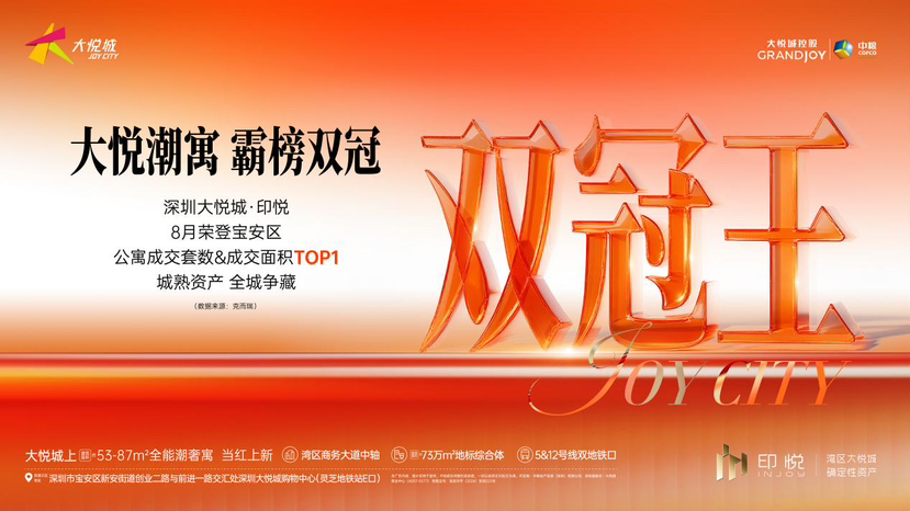 作为深圳大悦城购物中心上盖的稀缺独栋公寓资产,印悦公寓在大悦城开业后持续热销出圈,2025年8月荣登宝安区公寓成交面积&成交套数双冠王(数据来源:克而瑞)。项目国庆加推“双钥匙”爆款户型新品,再续热销佳绩。