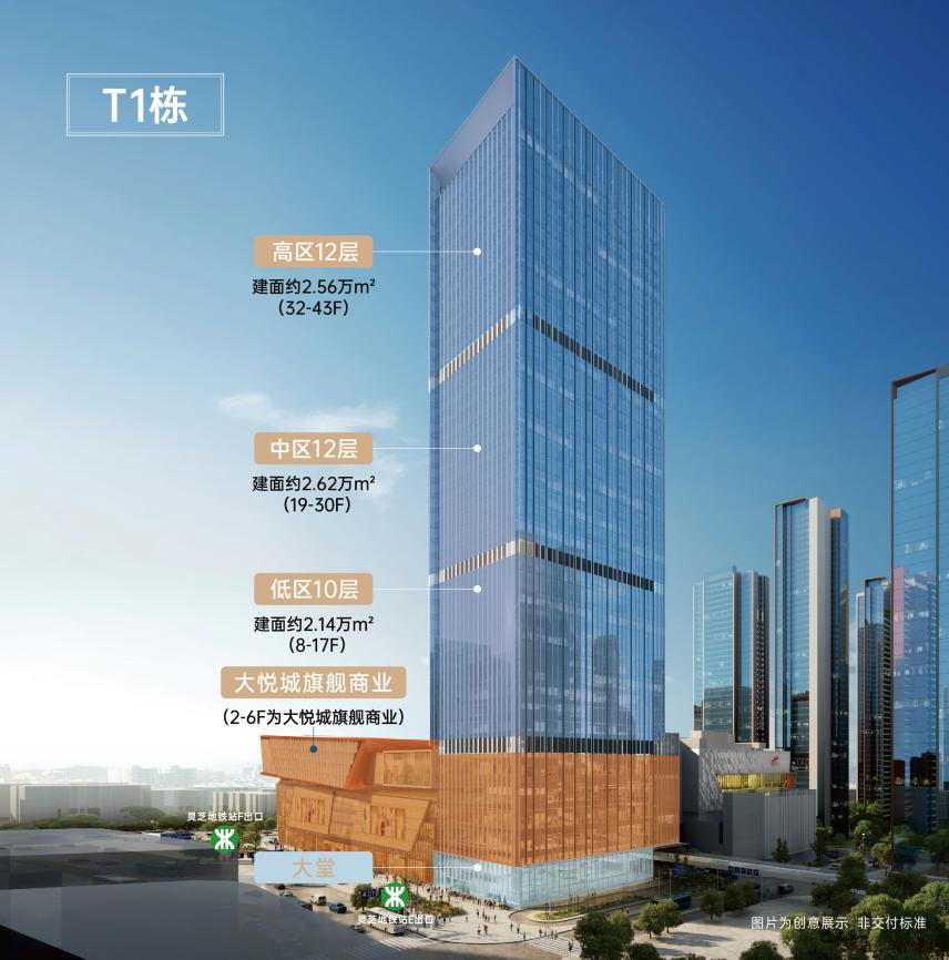 T1栋为大悦城旗舰商业上盖,合理分区,建面约90-25000㎡甲级商务空间全球租售。