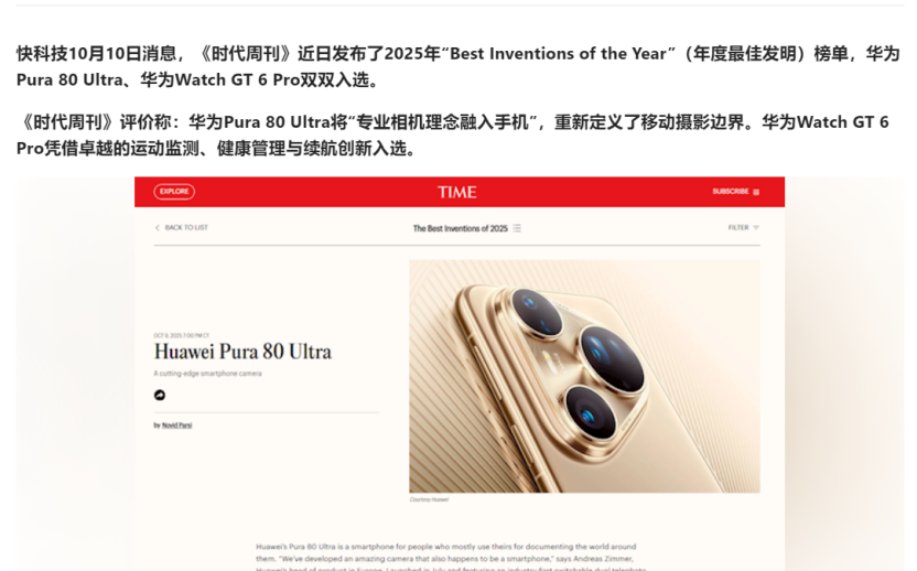 现场智能穿戴展品中,HUAWEI WATCH GT 6 Pro凭借运动监测、健康管理与续航方面的卓越创新,入选了《时代周刊》年度最佳发明榜单。与它一同入选的,还有HUAWEI Pura 80 Ultra,《时代周刊》称其“重新定义了移动摄影边界”。