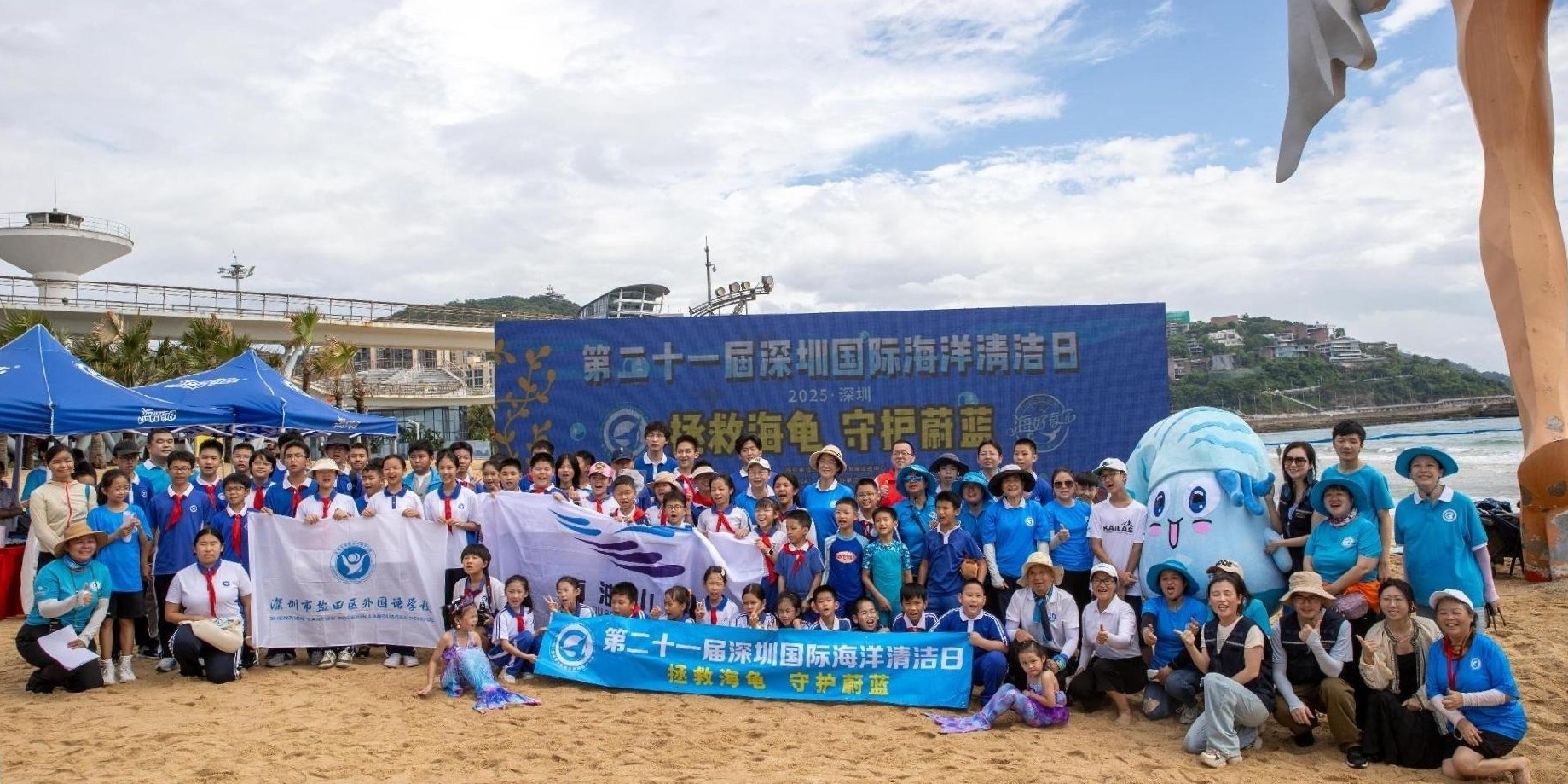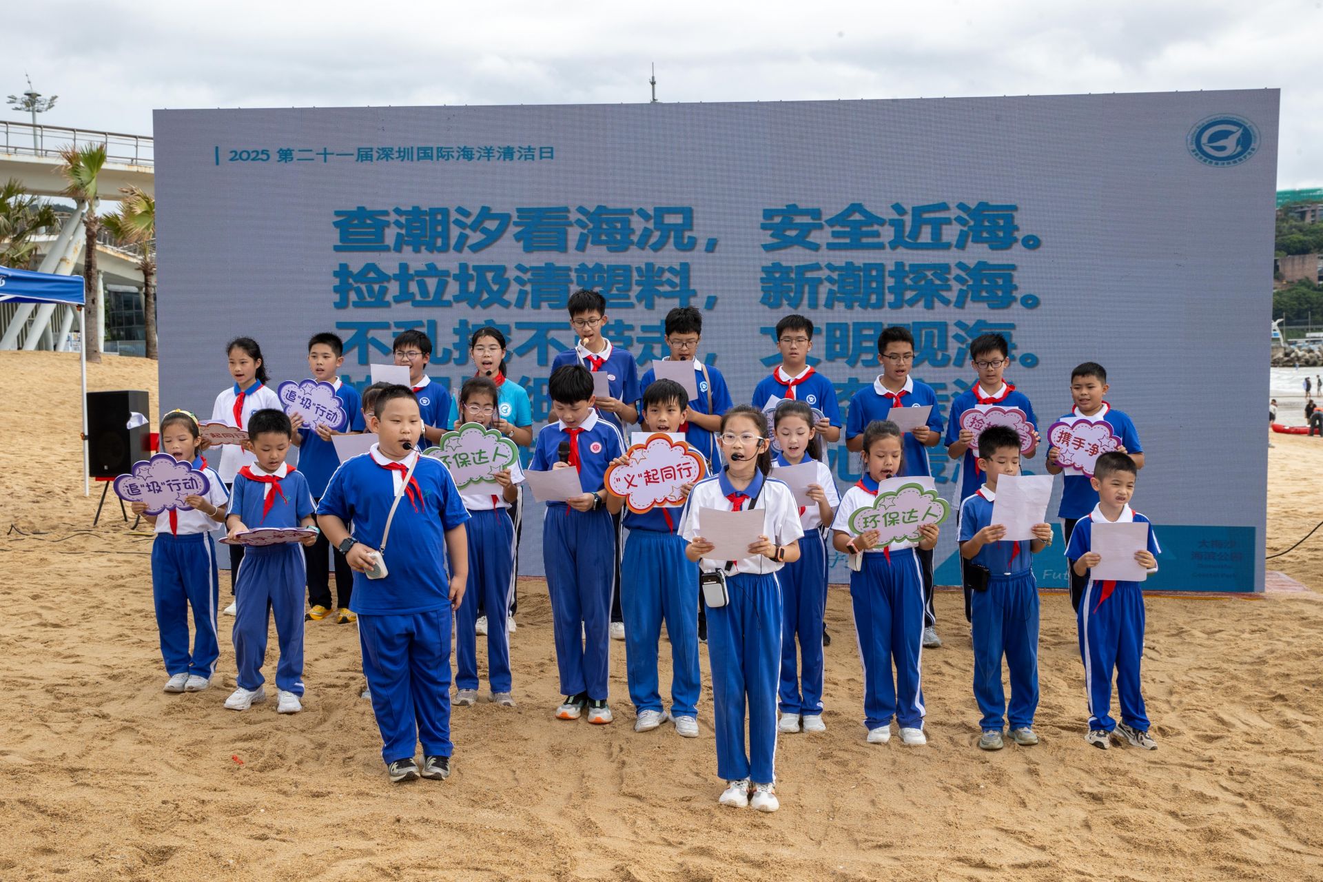 “查潮汐看海况,安全近海;捡垃圾清塑料,新潮探海;不乱挖不带走,文明观海;拍照片细观察,生态亲海;救海龟护江豚,爱心暖海!”在4位儿童海洋环保大使黄语齐、杨济睿、郭津硕、吕沁桐的带领下,盐田区外国语学校的学生代表们高举倡议牌,用清脆的声音发出“生态亲海”号召,稚嫩却坚定的宣言,让“海洋保护从娃娃抓起”的理念落地生根。