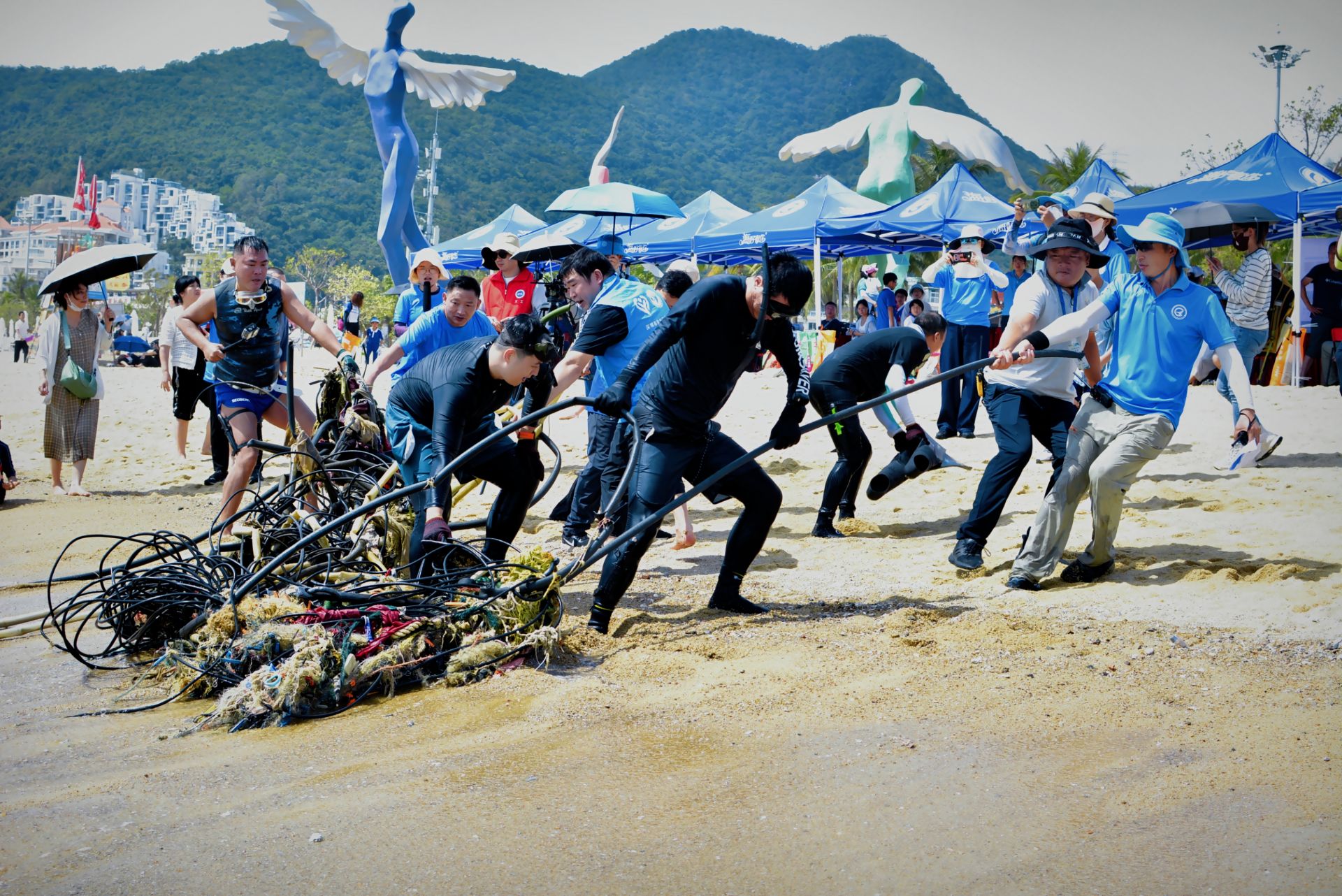 本届清洁日主题缘起,藏着一个温暖的故事——9月大梅沙海域,志愿者意外发现一只被渔网缠绕的海龟,一场紧急救助让海洋生态走进公众视野。以此为契机,活动不仅倡导文明赶海,更串联起“线上+线下”“科技+公益”的多元保护场景。早在9月“海洋清洁月”,300名志愿者已在10个分会场同步开展净滩行动;启动仪式当天,37名自由潜潜水员化身“海底清道夫”,手持网袋潜入海中捡拾垃圾,达沃客(珠海)智能科技有限公司提供的水下直播设备,更让无法到场的公众通过屏幕“云参与”,实时见证海底垃圾被清理的每一个瞬间。
