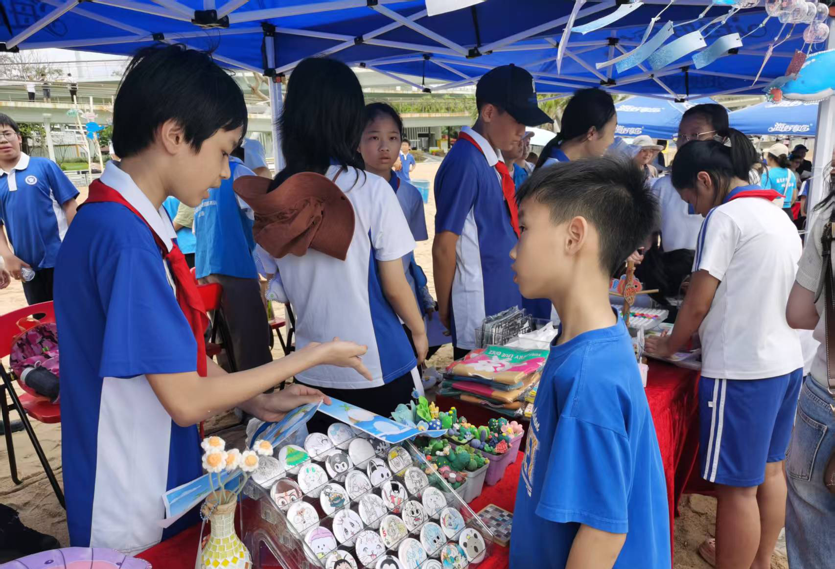 若说净滩行动是“实践课”,那同步开启的海洋环保嘉年华,便是一场趣味十足的“海洋知识派对”。南油小学、深大附中福田创新中学、景莲小学的同学们化身“知识摊主”,把课堂搬到沙滩:“潮间带生物拼图”前,小朋友们对着海葵、海胆、螃蟹图案认真拼接;“海洋环保飞行棋”棋盘上,“捡到塑料瓶前进3步”“乱扔垃圾后退2步”的规则,让孩子在游戏中记住环保常识;盐田区外国语学校的摊位更具创意——孩子们用彩笔在画板上画出心中的蓝色家园。