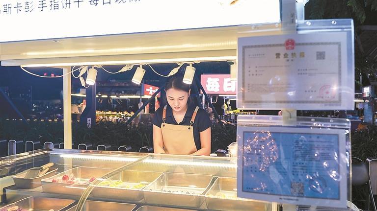 柯小姐的“邻居”,是卖提拉米苏的陆小姐。记者注意到,陆小姐的摊位前醒目地挂着经营执照,摊位车辆更是经过精心改造,在充满烟火气的夜市中,透着一股独有的“清新雅致”。“以前我就是用泡沫箱加小推车摆摊,既不规范也不方便。社区规划摊位后,我特地升级定制了这辆餐车,里面带冰柜,还设置了座位,能让客人更舒适地品尝甜品。”