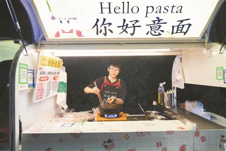 在福城街道宝源科技园疏导区,摊主忙碌地为顾客制作意面。