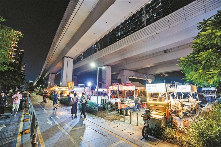 经过大半个月的试点磨合,再加上国庆黄金周假期的实际考验,这场治理行动的成效究竟如何?10月10日晚,记者现场走访福城街道宝源科技园疏导区以及民治街道红山地铁站D出口疏导区,眼前的景象令人耳目一新:昔日里,流动摊贩为躲避监管四处“打游击”,占道经营现象频发,常常造成交通阻塞的“拥堵点”,如今在精细化治理措施的推进下,已蜕变为摊位规整、经营有序的“便民区”。“市井烟火”与“公共秩序”在治理实践中,找到了难得的平衡点。