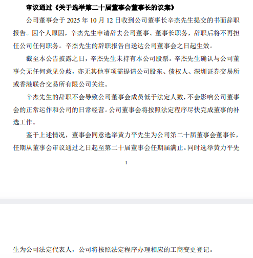 公告称,辛杰先生的辞职报告自送达董事会之日起生效。辛先生未持有公司股票,并确认与董事会无任何意见分歧,亦无其他事项需提请公司股东、债权人、深圳证券交易所或香港联合交易所有限公司关注。辛先生的辞任不会导致董事会成员低于法定人数,不会影响董事会的正常运作和公司的日常经营。董事会将按照法定程序尽快完成董事的补选工作。