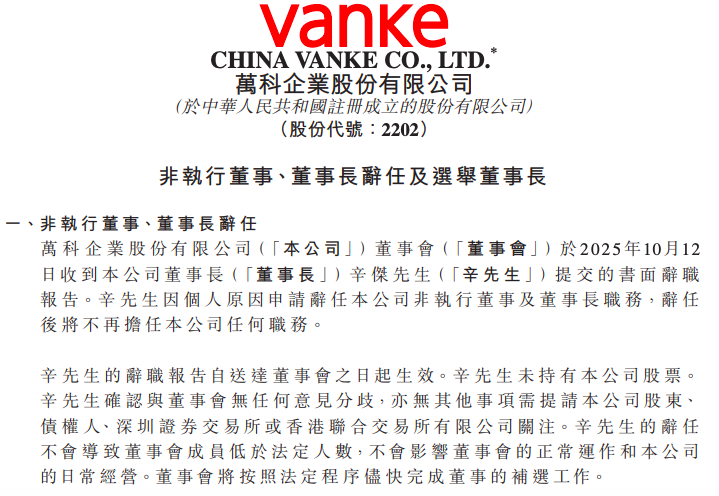 10月13日,万科企业在港交所公告称,公司董事会于2025年10月12日收到董事长辛杰先生提交的书面辞职报告。辛杰先生因个人原因申请辞任公司非执行董事及董事长职务,辞任后将不再担任公司任何职务。同时,第二十届董事会第二十四次会议已选举黄力平担任董事长。