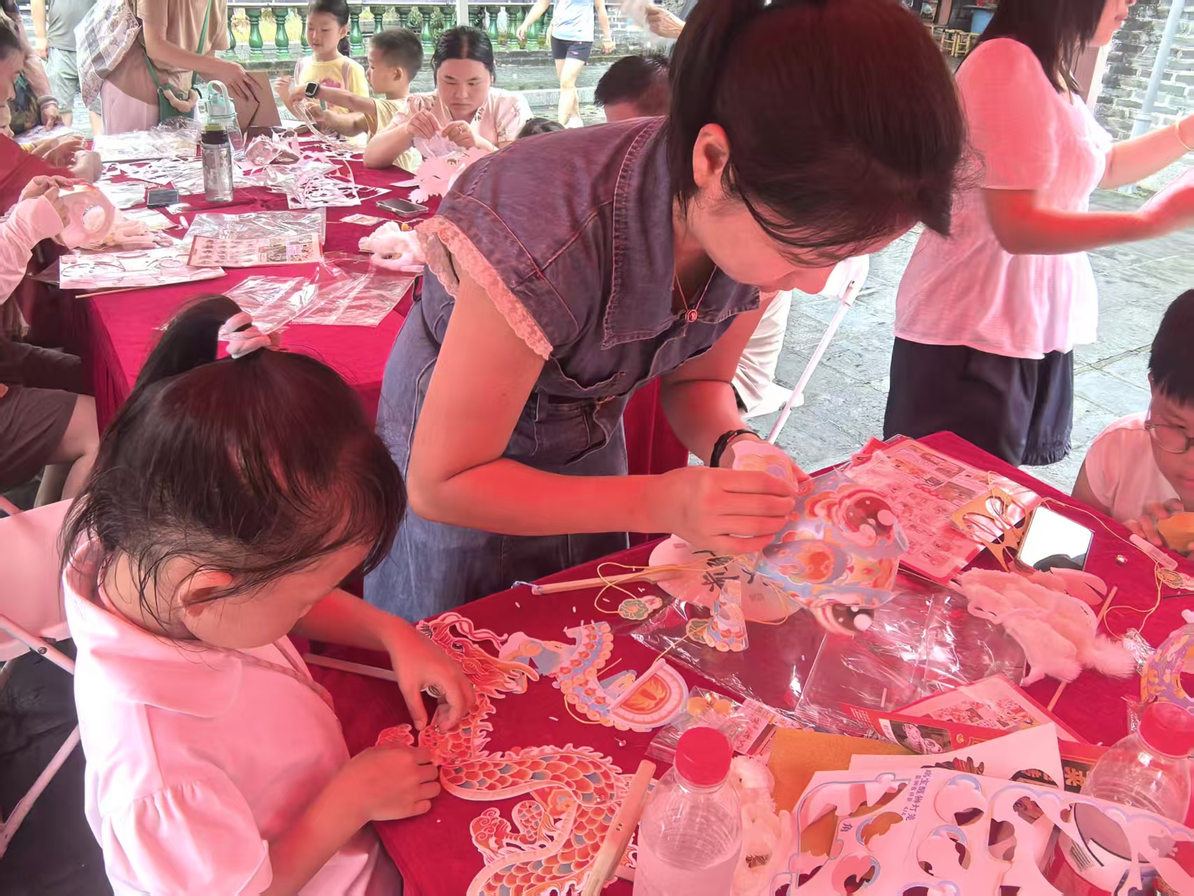 活动中,在非遗传承人的引导下,居民们兴致勃勃地围坐桌前,或手持画笔在漆扇上勾勒雅致纹样,或穿绳固定醒狮灯笼的骨架,全场洋溢着温馨的氛围。紧接着,一场别开生面的汉服表演登场,活动气氛推向高潮——表演者执扇翩跹,伴琴吟唱,举手投足间尽示典雅之美。往来的人们纷纷驻足观赏,沉醉在这份古韵悠长的景致里。