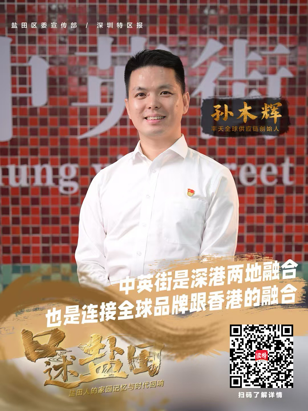 孙木辉: 1987年出生于广东汕尾,深圳市丰天全球供应链有限公司总经理。大学毕业后开启创业之旅,从协助供应链工作起步,16年如一日深耕投身跨境电商领域,见证并参与行业从无到有、从小到大的发展历程。2019 年,带领丰天全球供应链团队重返中英街开启二次创业。如今,作为盐田区人大代表和丰天全球供应链负责人,专注于“前店后仓”与“线上 + 线下”的跨境新零售模式,在盐田这片热土上持续奋斗,深深扎根。
