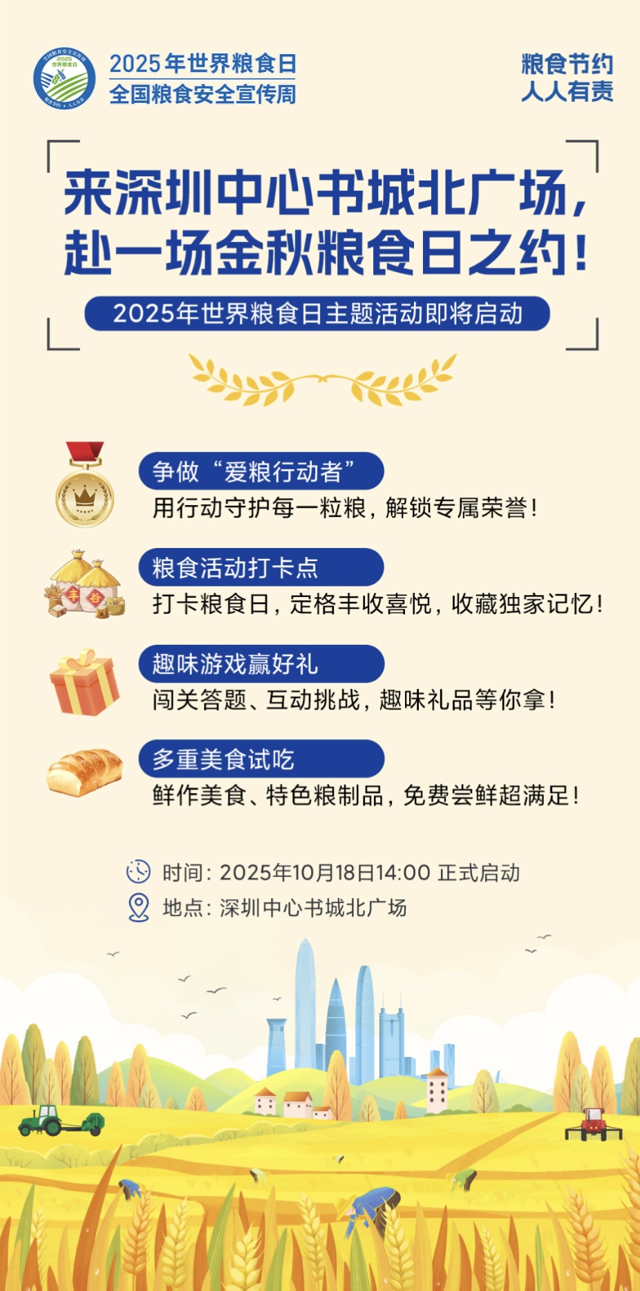 10月18日下午,深圳中心书城北广场将举办2025世界粮食日暨全国粮食安全宣传周主题活动,活动现场将设置三大特色区域:打卡互动区通过图文展板、不同品种粮食样本实物展示,直观呈现粮食从田间到餐桌的生产、储存全过程;“节约粮食”互动游戏区准备了趣味挑战,市民完成互动即可获赠定制小礼品,让节粮理念“玩”出来;企业展示区则汇聚深圳本土餐饮及粮食企业,集中呈现绿色餐饮理念与优质粮油产品,展现深圳粮食产业的高质量发展成果。