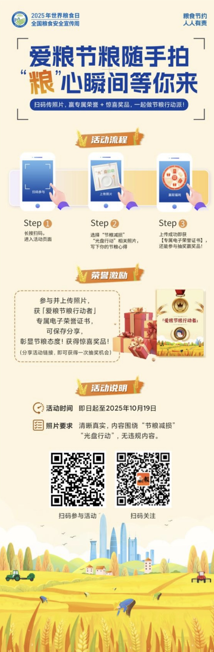 民以食为天,粮安天下安。2025年10月16日是第45个世界粮食日,所在周是我国粮食安全宣传周,为深入贯彻落实国家及广东省关于粮食安全工作的部署要求,深圳市将围绕世界粮食日“手拉手共倡多样美食,聚合力同创美好未来”与全国粮食安全宣传周“粮食节约 人人有责”两大主题,开展系列特色活动,以多样化形式普及粮食安全知识,引导全社会形成爱粮节粮、守护粮安的浓厚氛围。