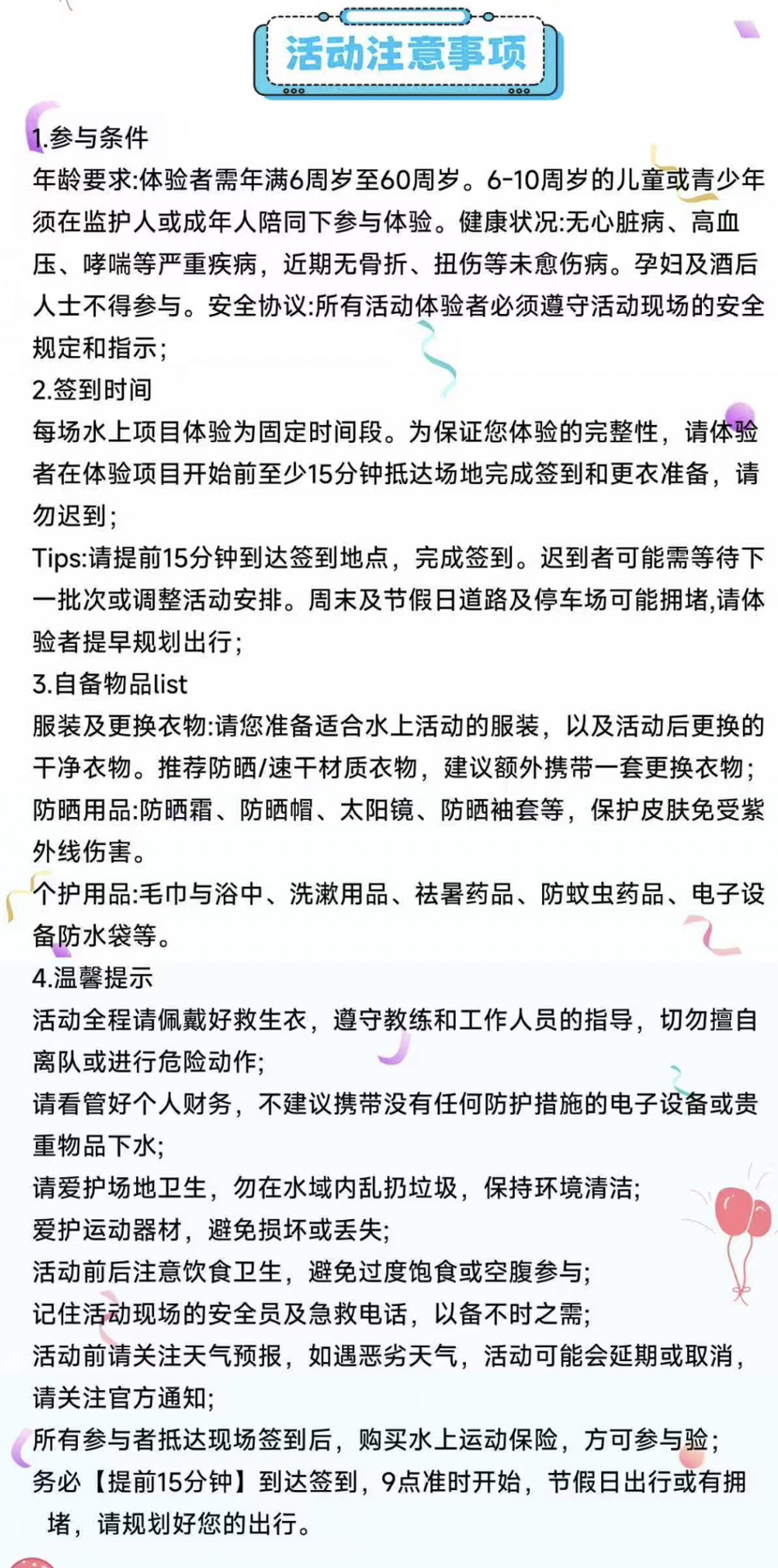 考虑到水上运动的特殊性,为全力保障每位参与者的安全,确保活动有序推进,主办方要求,在年龄方面,体验者需年满6周岁至60周岁,其中6-10周岁儿童或青少年须由监护人或成年人陪同参与;健康条件上,明确无心脏病、高血压、哮喘等严重疾病,且近期无骨折、扭伤等未愈伤病者方可参与。同时,现场将要求所有体验者全程佩戴救生衣,严格遵守教练与工作人员指导,避免擅自离队或进行危险动作。