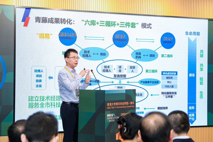 周年庆典上,深圳市新质生产力科技促进中心主任王辉介绍了“深圳科创青藤成果转化服务体系”。该体系作为聚焦早期科创项目转化的平台,通过人才、项目与资本的多轮互选机制,助力项目落地与资源对接。香港大学深圳研究院、香港大学青年科创学院与深圳市新质生产力科技促进中心共同签署了战略合作协议,未来将围绕成果转化体系共建、技术转移推动及科研设施共享等方面展开合作,共同促进香港大学科研成果在大湾区的转化与应用。