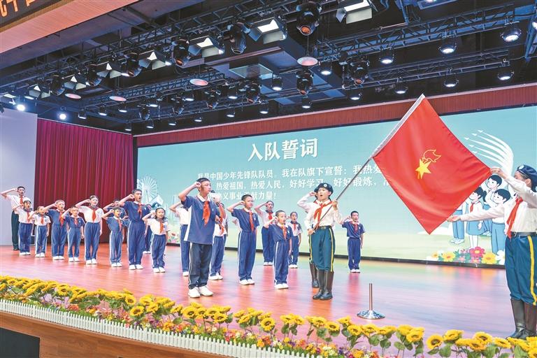 活动在《歌唱祖国》的激昂旋律中拉开帷幕,少先队员们齐唱国歌,目光坚定。伴随着铿锵的出旗曲,三名旗手高擎队旗入场,全体齐唱《中国少年先锋队队歌》,嘹亮歌声激荡人心。随后,五年级队员换戴大号红领巾、新队员入队仪式庄严开展。“热爱中国共产党,热爱祖国,热爱人民”的誓言响彻全场。仪式后的情景朗诵《红领巾颂》和歌舞表演《少年有志》更以深情演绎和蓬勃朝气,展现了新时代少先队员立志报国的昂扬风貌。