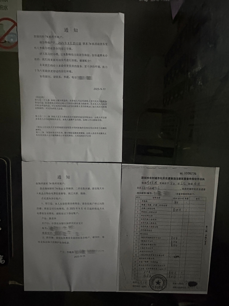 “2021年,我看到楼栋挂着‘房东直租’的牌子,联系上房东黄琼后就签了合同。住了4年,怎么也想不到突然冒出个‘真房东’来。我们的血汗钱难道要打水漂?”在龙华区民治街道隔圳新村74栋,租户朱先生无奈的话语,道出了近30户邻居的共同困境。