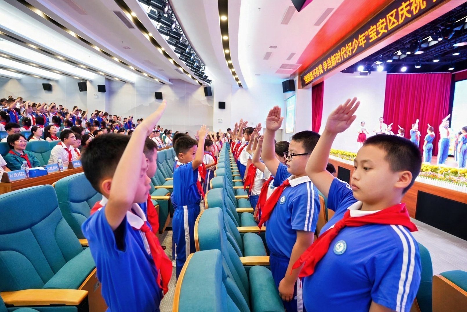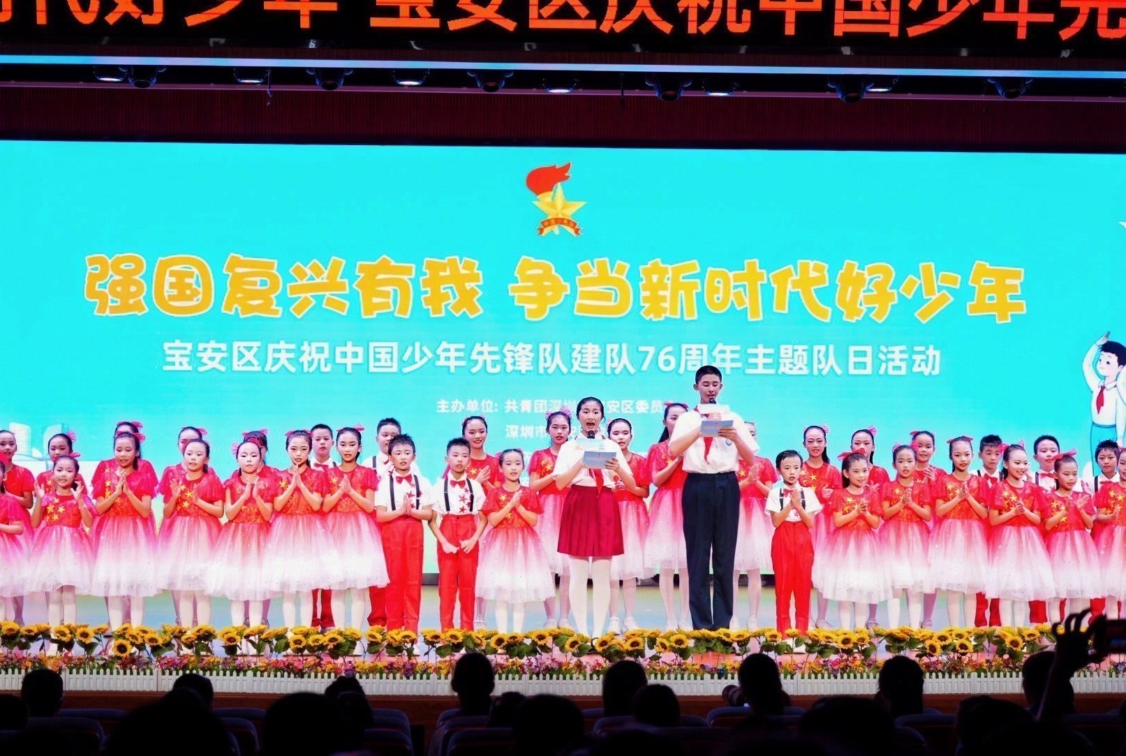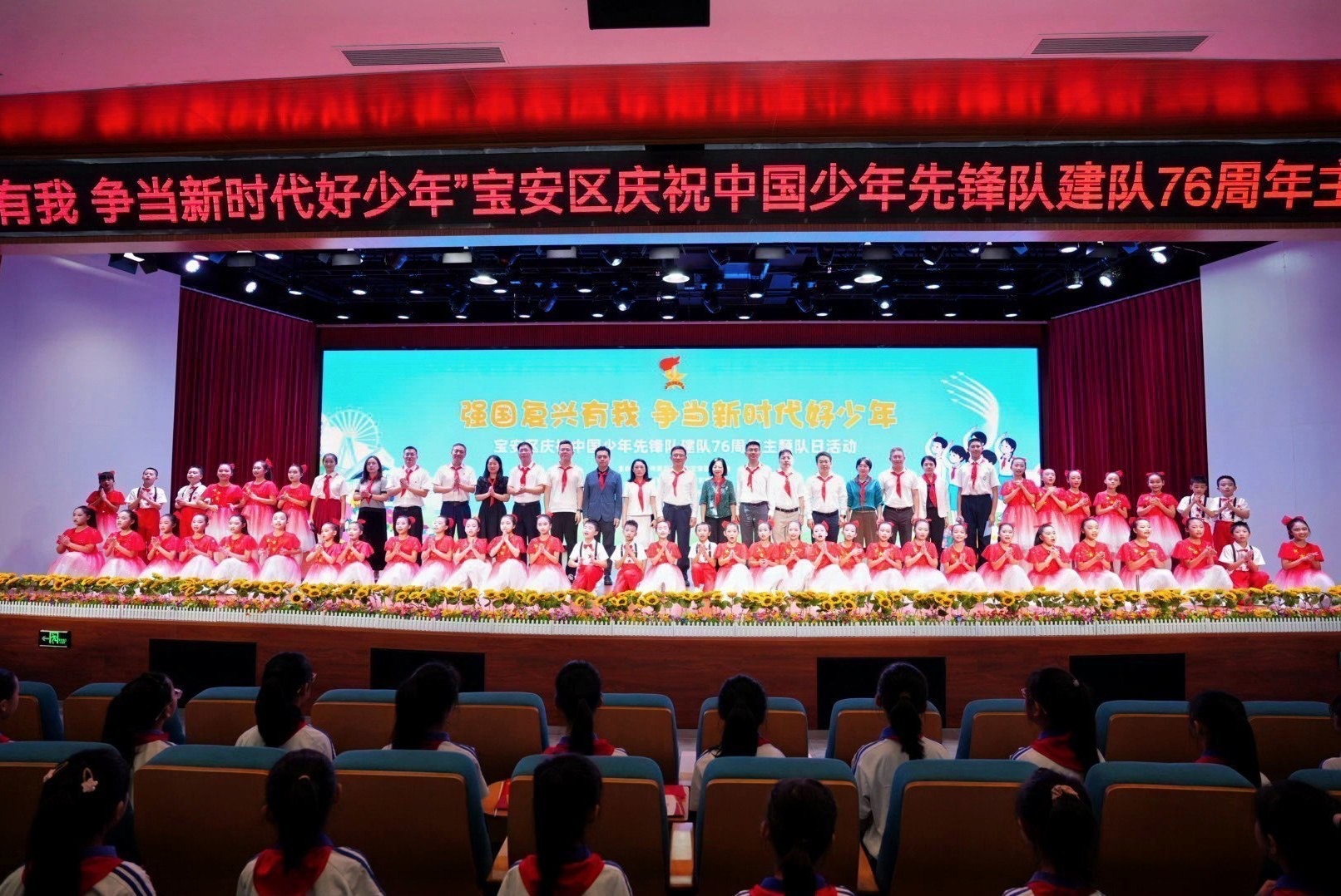 10月13日下午,由共青团宝安区委员会、宝安区教育局、少先队宝安区工作委员会联合主办的“强国复兴有我 争当新时代好少年”宝安区少先队庆祝中国少年先锋队建队76周年主题队日活动在宝安区西乡实验学校圆满举行。区委常委、宣传部部长、教育工作领导小组组长周学良,区政协副主席杨雁、区关工委常务副主任廖欣等领导出席活动,与全区少先队员和辅导员老师代表共同庆祝这一光荣的日子。