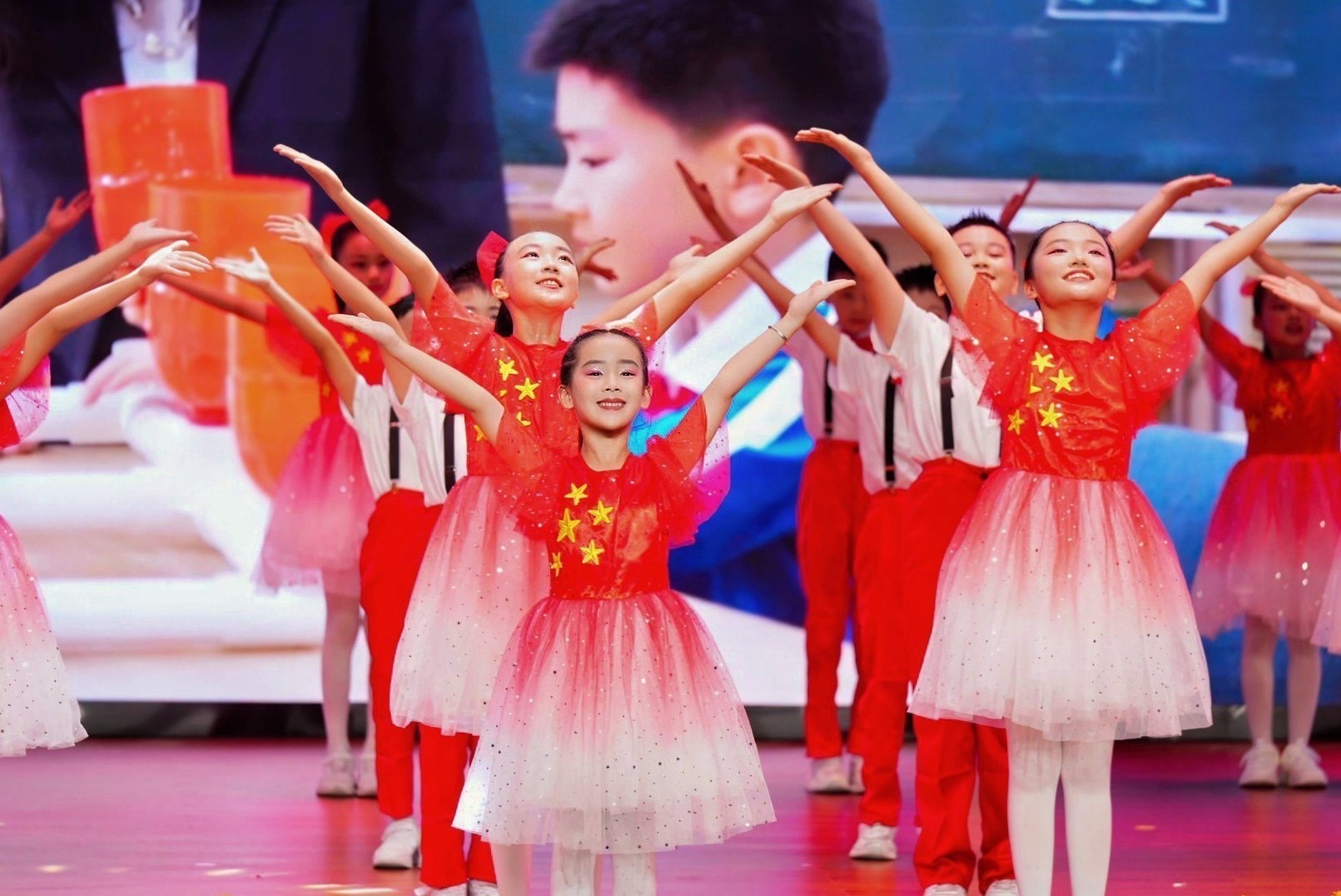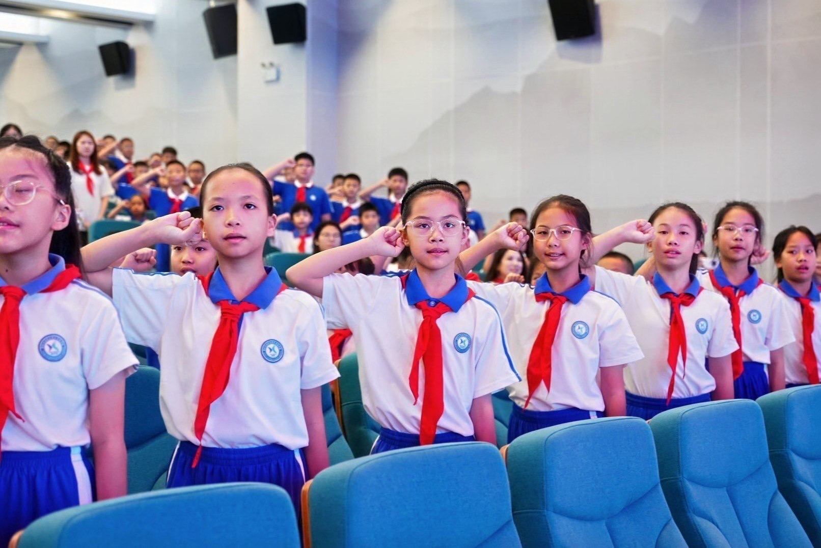 活动在《歌唱祖国》的激昂旋律中拉开帷幕,少先队员们齐唱国歌,目光坚定。伴随着铿锵的出旗曲,三名旗手高擎队旗入场,全体齐唱《中国少年先锋队队歌》,嘹亮歌声激荡人心。随后,五年级队员换戴大号红领巾、新队员入队仪式庄严开展。“热爱中国共产党,热爱祖国,热爱人民”的誓言响彻全场。仪式后的情景朗诵《红领巾颂》和歌舞表演《少年有志》更以深情演绎和蓬勃朝气,展现了新时代少先队员立志报国的昂扬风貌。