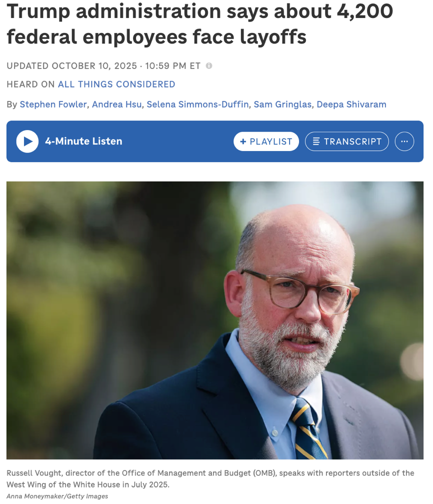 事实上,此轮裁员并非完全出于被动。特朗普政府早在竞选阶段就主张“瘦身华盛顿”,将联邦官僚体系描绘为冗余、低效、拖慢决策的源头。 如今,在预算停摆与国会僵局的背景下,白宫将此视为实施改革的契机。裁员与机构合并自然成为行政改革的工具,而不再是单纯的财政应急措施。