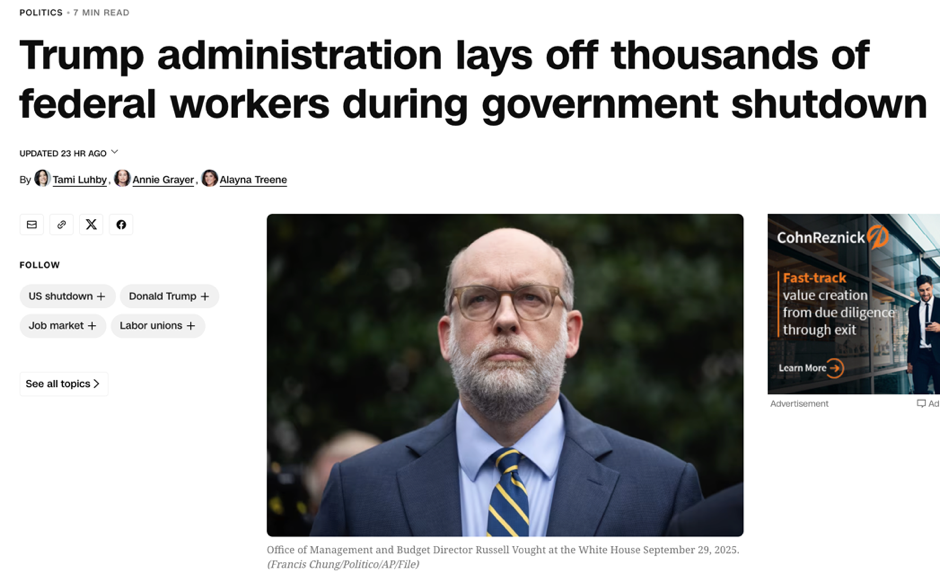 其实,自10月10日起,就有不少联邦雇员陆续接到解雇信。他们原本以为,只要拨款恢复,就能重返岗位,如今这一希望被彻底击碎,也使得进入第三周的政府关门形势更加难以预料——“裁员”正在从预算停摆的附带风险,演变为最醒目的现实问题,也成为约翰逊此番言论的一个现实背景。