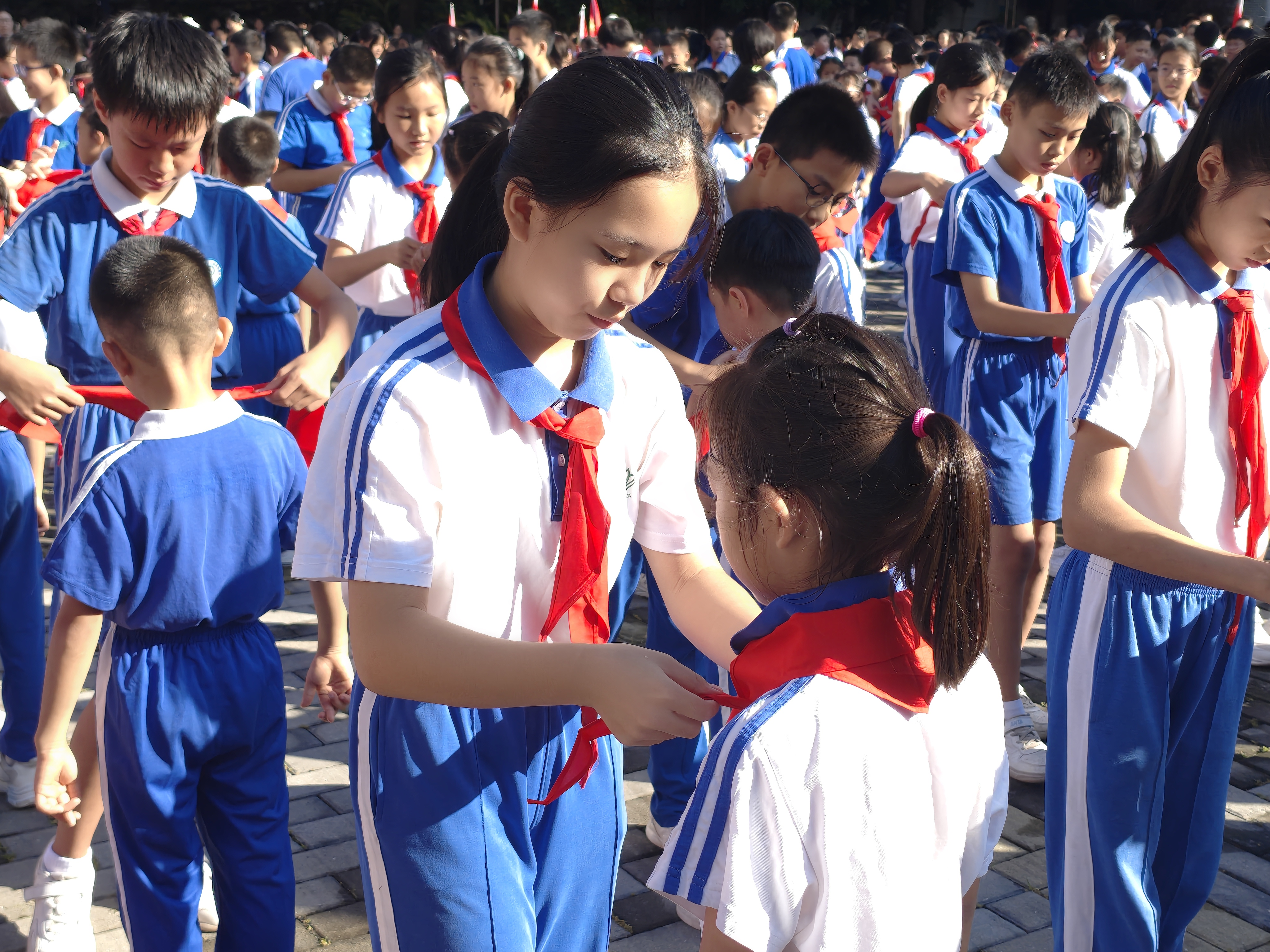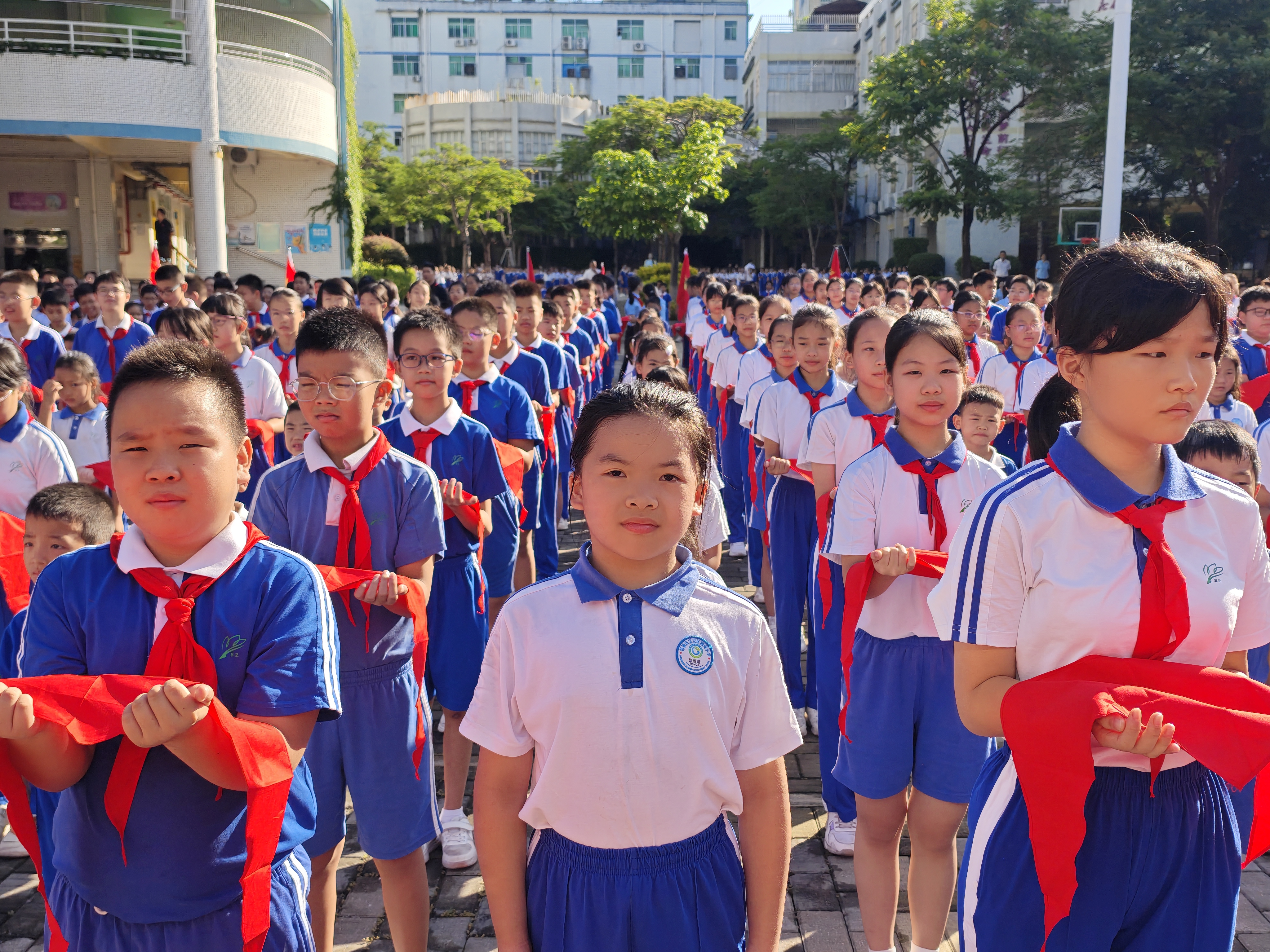 伴随着庄严的国歌声,五星红旗在固戍小学操场上空冉冉升起。少先队队旗迎风飘扬,五年级少先队员代表为新队员佩戴上鲜艳的红领巾。新队员面向队旗庄严宣誓,老队员重温入队誓词,铿锵誓言回荡在校园上空,展现出新时代少先队员昂扬向上的精神风貌。
