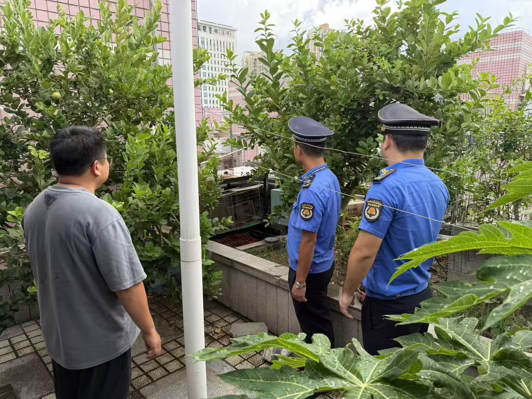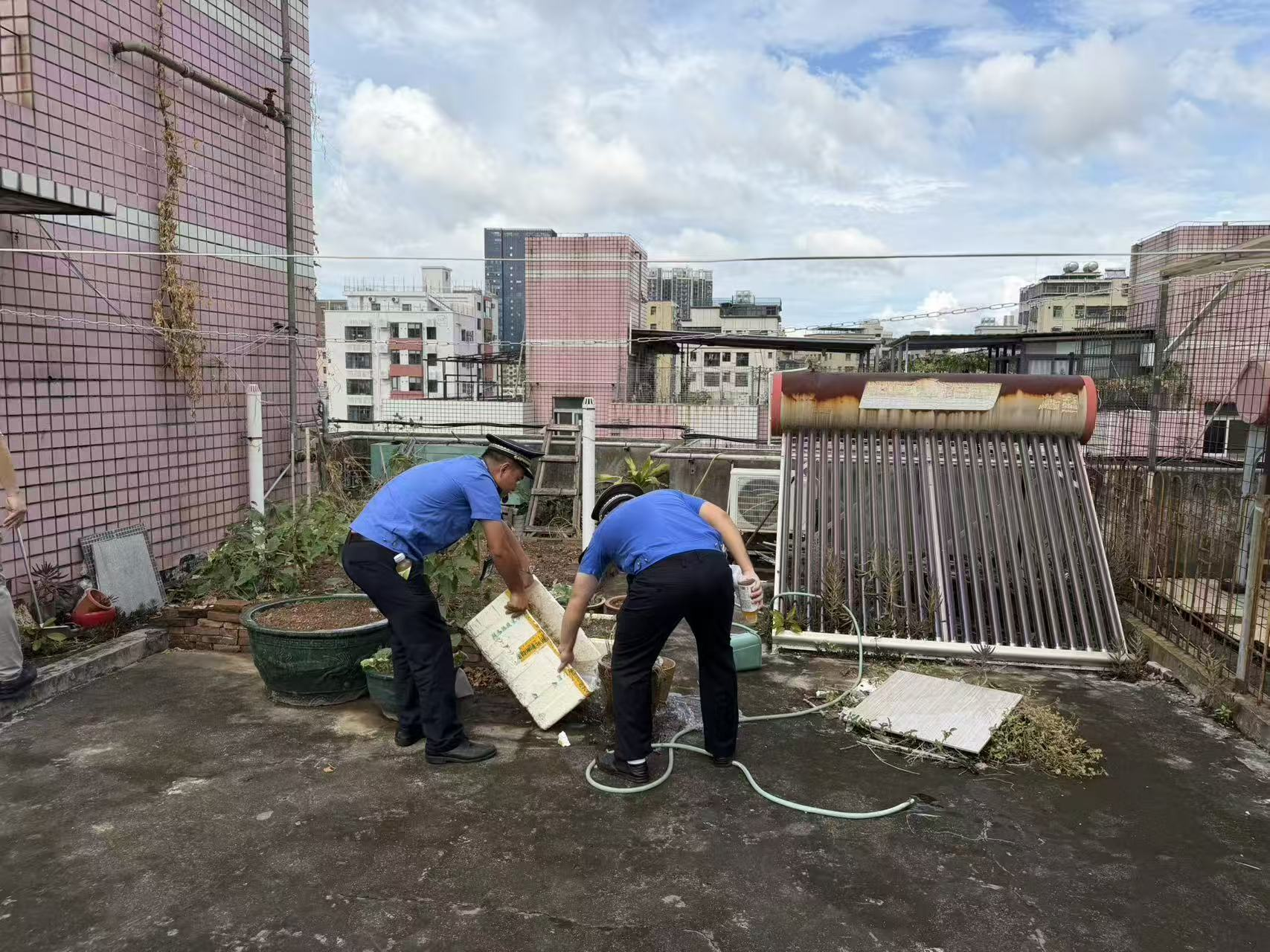 类似情况也出现在麻布社区华侨新村。10月12日上午,街道执法四中队联合麻布社区对华侨新村易积水区域开展“拉网式”排查,重点检查楼顶房前露天容器、绿植花盆、闲置杂物等蚊虫易滋生点位。当天中午,巡查小组在华侨新村某出租屋检查时,发现该楼栋庭院内的废弃鱼缸、花盆托盘等容器有大量积水,水中已有蚊虫幼虫浮游,容器边缘可见成蚊活动,存在明显的蚊媒传播风险。执法人员现场对业主进行普法教育,并依法给予警告,责令限期整改,落实防蚊灭蚊措施。