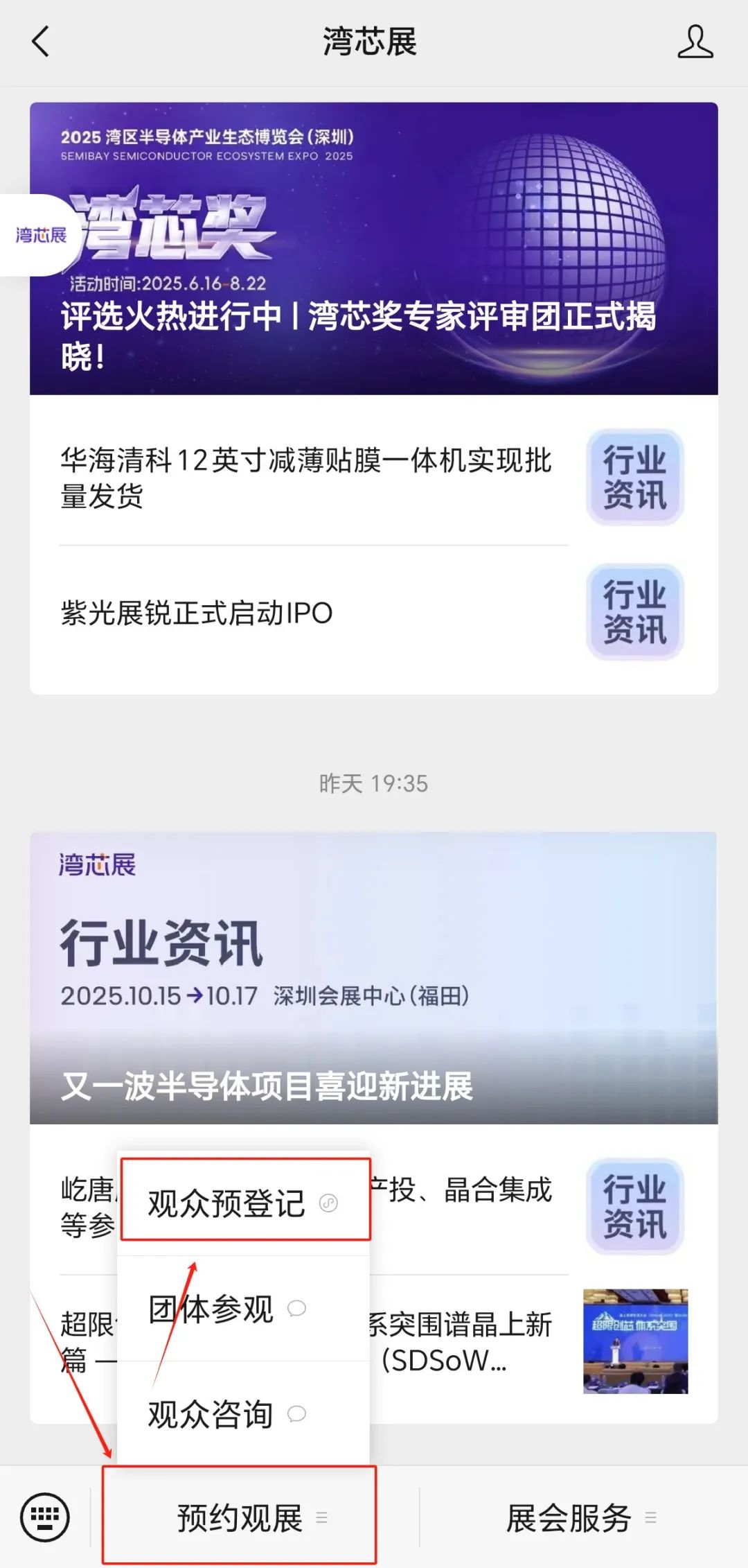 1、微信公众号:打开“湾芯展”微信公众号,首页菜单栏点击“预约观展”——“观众预登记”;