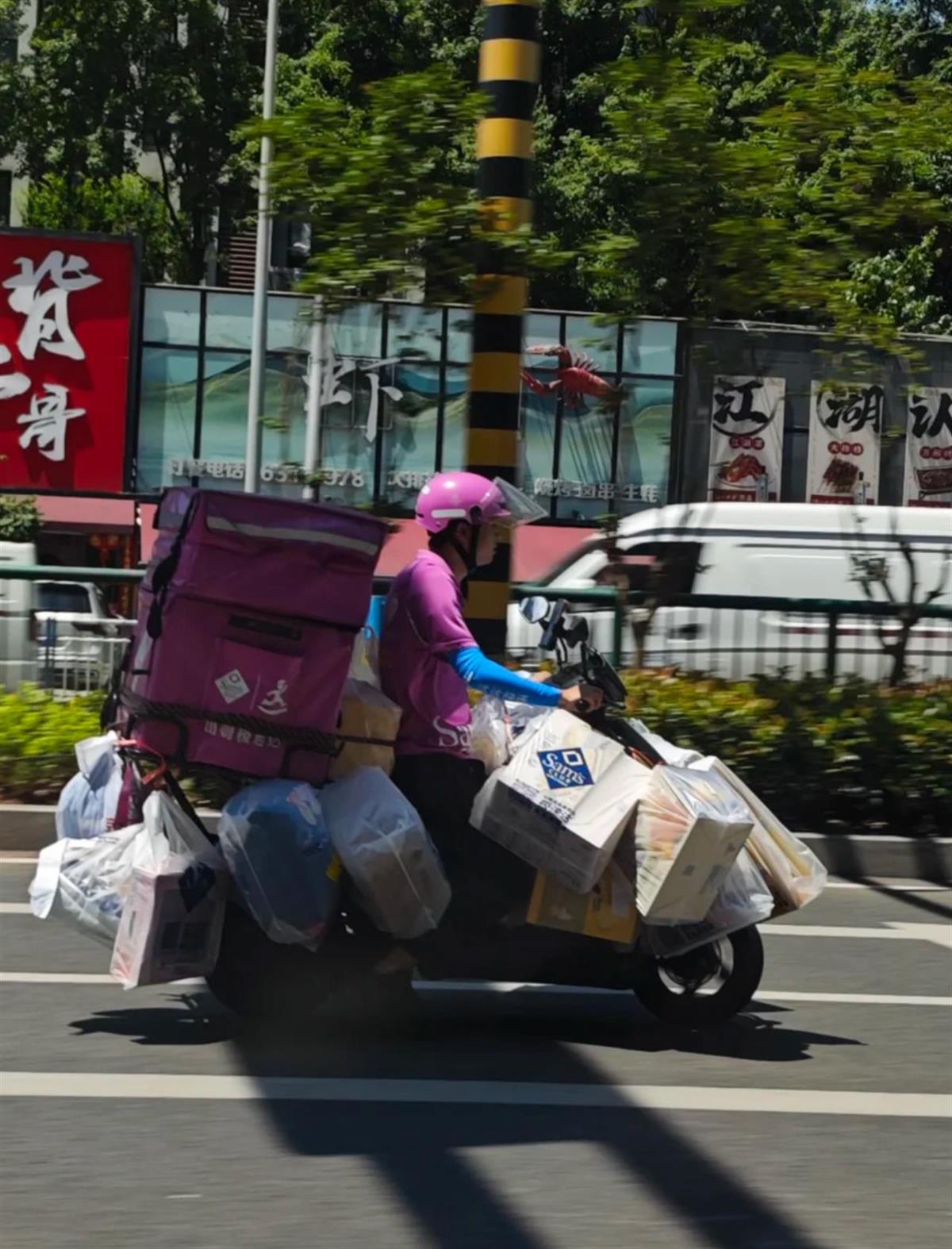 近日,有网友在社交平台上传了几张山姆配送员骑电动车送货的照片,引发网络“围观”。照片中,电动车除了后座行李架放着货箱之外,脚踏板处也堆放着物品,车身前后都挂满了包裹,成了一辆“全身挂货”的“全挂车”。