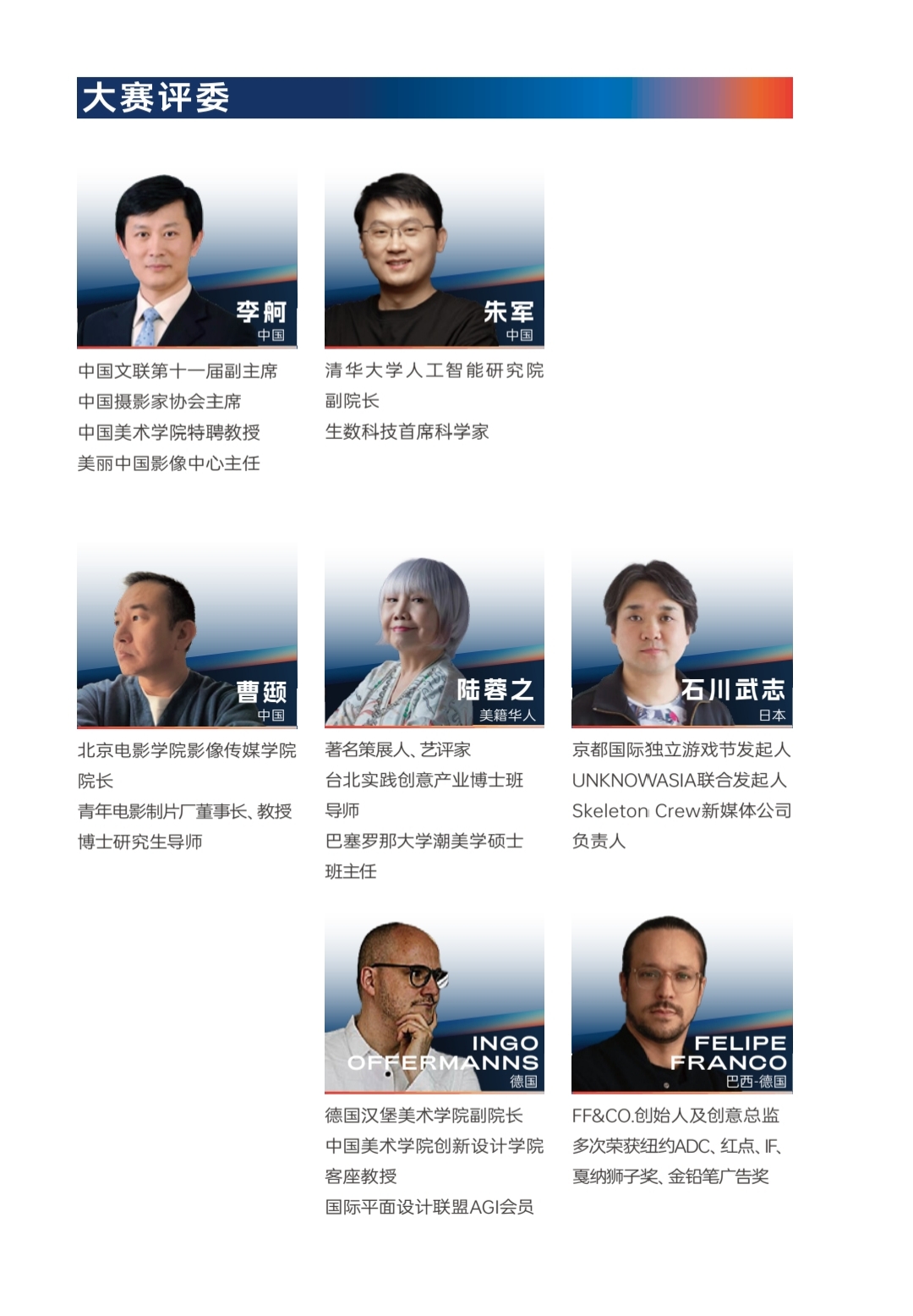 评审团汇聚东西方顶尖专家,包括中国摄影家协会主席李舸、清华大学教授朱军、资深动画导演曹颋、著名策展人陆蓉之等国内权威,以及来自日本的石川武志、德国的Ingo Offermanns和巴西的Felipe Franco三位国际大师。