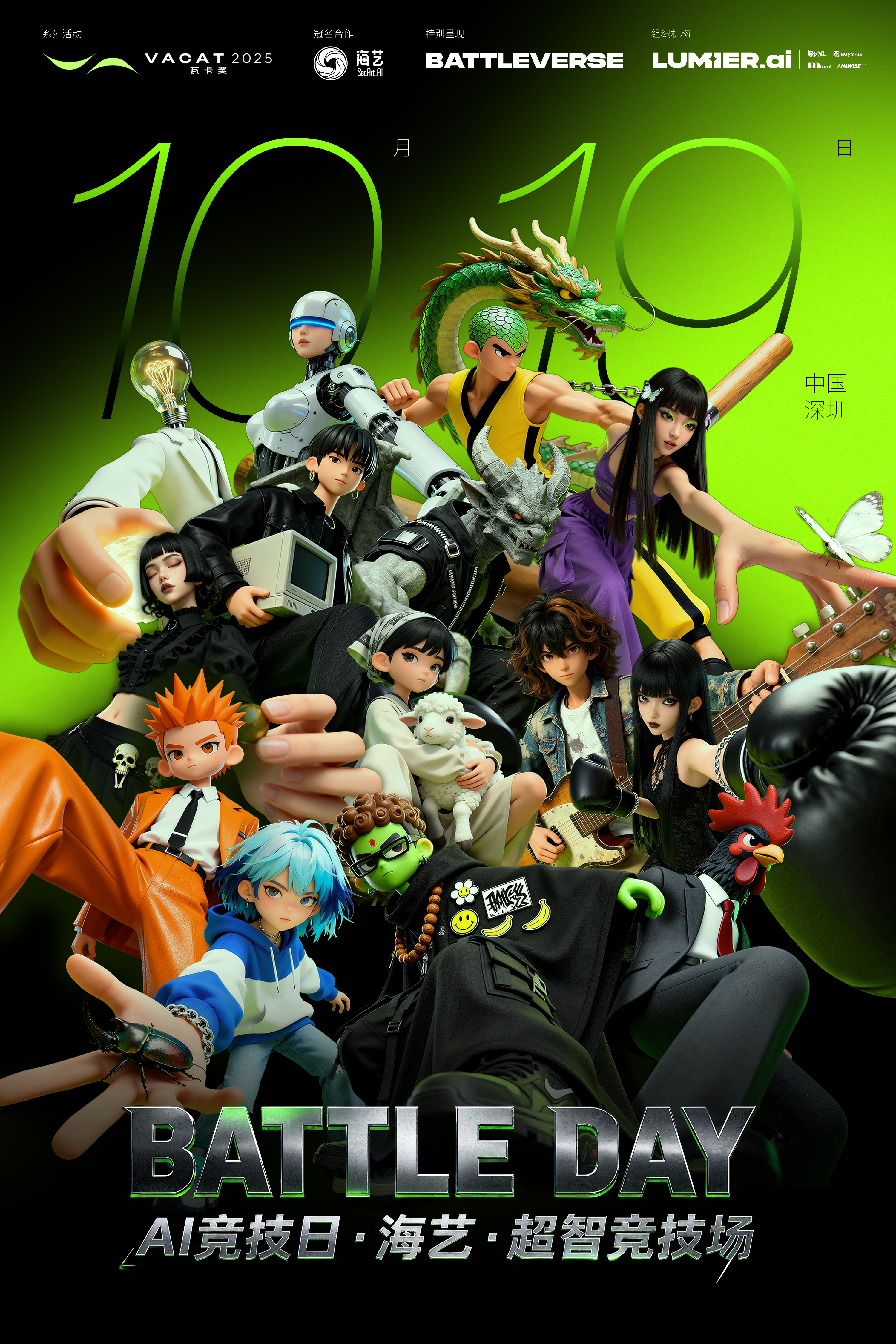 AI竞技日(10月19日):AI实时竞技(PromptBattle)充满悬念与激情。活动分高校组与专业组,选手需在限定时间内完成命题创作,过程全程直播,考验创作者的临场应变能力。