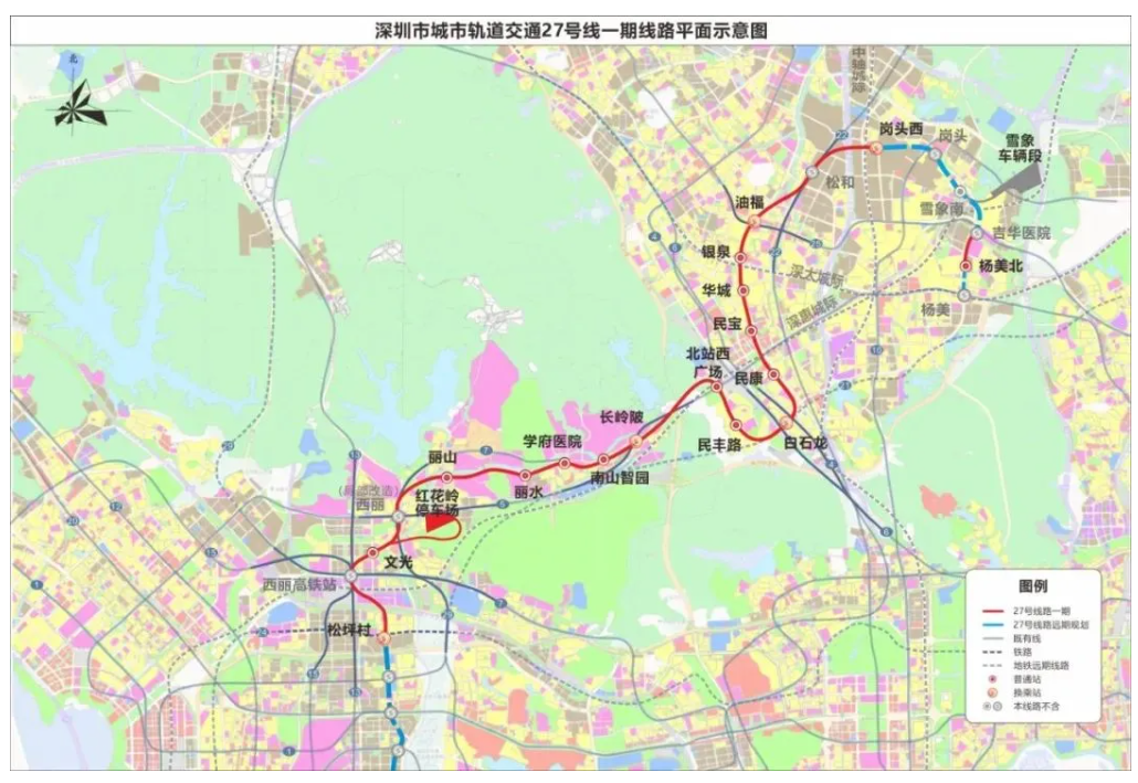 地铁27号线一期工程起自南山区松坪南站,终至龙岗区岗头西站,全长约25公里,共设21座车站,全部为地下站。建成后将串联起南山、龙华、龙岗三区,途经粤海、西丽、桃源等片区,从南山至龙华45分钟即可直达。