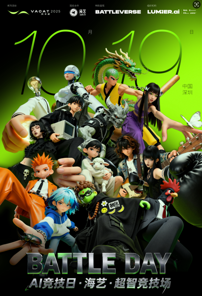 AI竞技日(10月19日)AI实时竞技(PromptBattle)充满悬念与激情。活动分高校组与专业组,选手需在限定时间内完成命题创作,过程全程直播,考验创作者的临场应变能力。