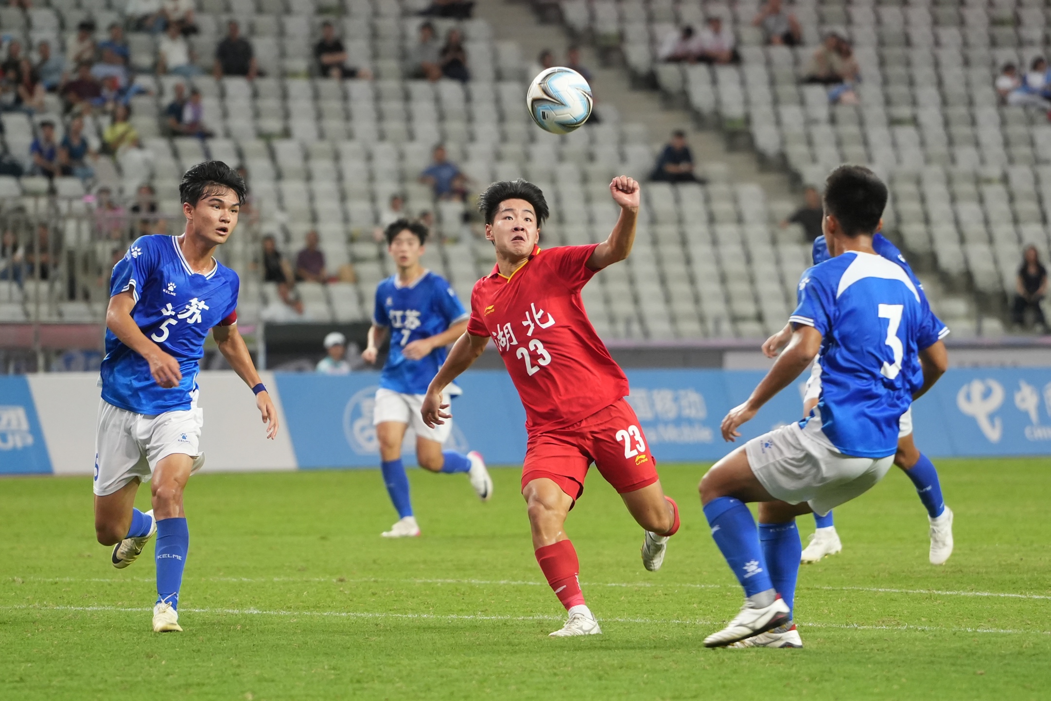 晚间,江苏队与湖北队开场即展开对攻。以资格赛小组第二晋级决赛阶段的江苏队,明显在进攻节奏和奔袭速度上更胜一筹。开场5分钟,江苏队便由12号叶文杰打进一球,3分钟后,江苏队7号苗润东再下一城。湖北队随后虽全力反扑,但双方在对攻中均无建树,江苏队最终以2比0取得小组开门红。