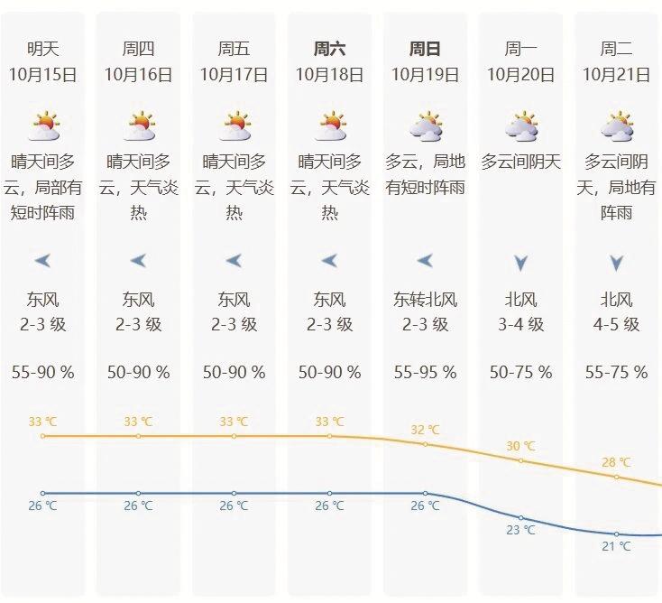 深圳天气如何?据市气象台预报,预计10月15日-19日多云到晴天,天气炎热;10月20日起受冷空气影响,北风加大,气温下降。气温或可降至2字头,但入秋就有点难了。