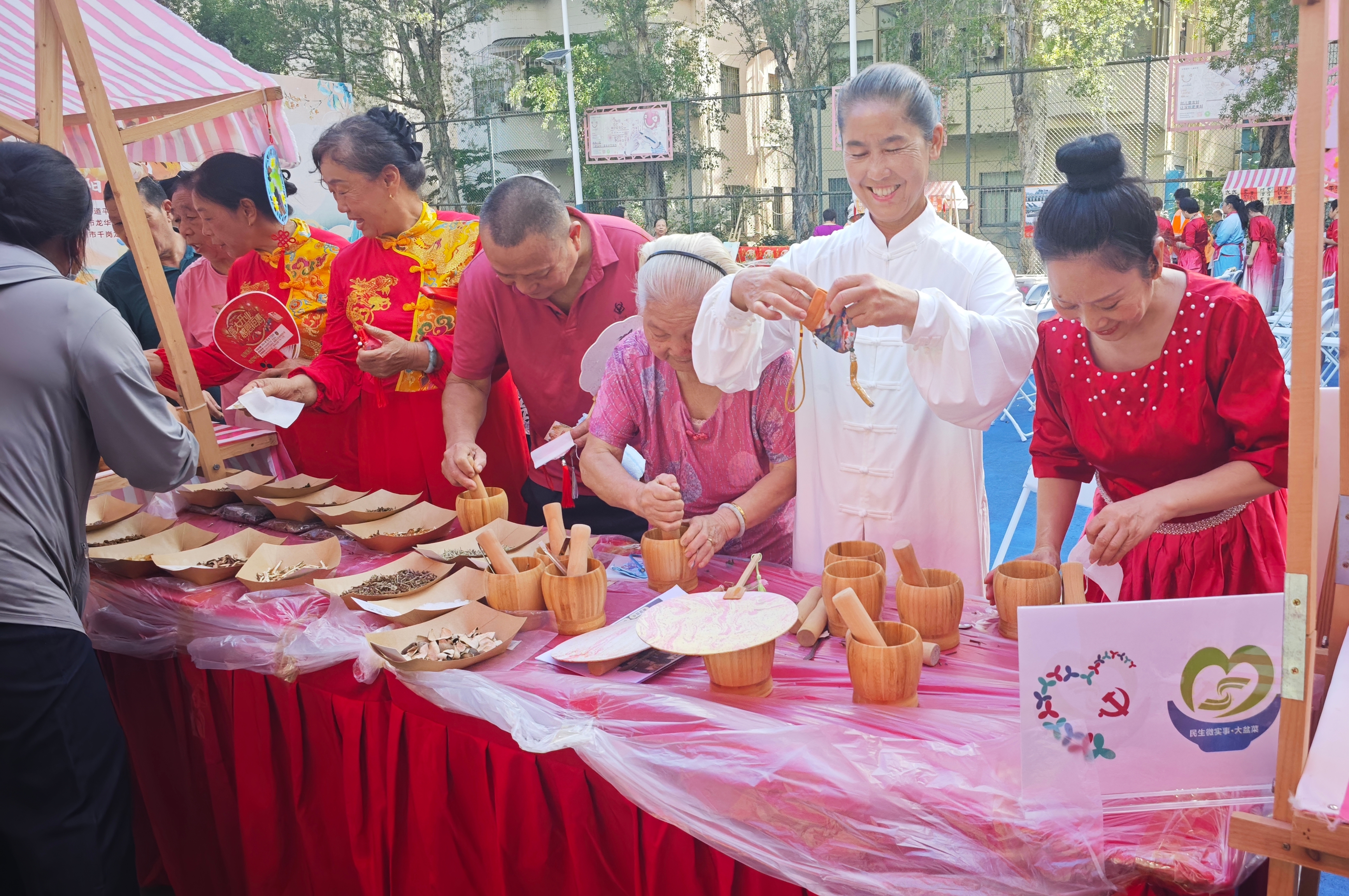 现场笑语盈盈,100余名长者持专属入场券参与,欣赏完舞台演出后,手工区非遗体验人气高涨:长者们缝制艾草香囊,感受“衣冠疗法”的健康智慧与祈福传统;体验古法漆扇制作,将素白扇面浸漆,捕捉自然纹样创作专属作品。游戏区里,沙包投掷、定点套圈等项目吸引踊跃参与,集章可兑换吉祥重阳糕;茶点区的菊花茶、各式水果更显细致关怀。