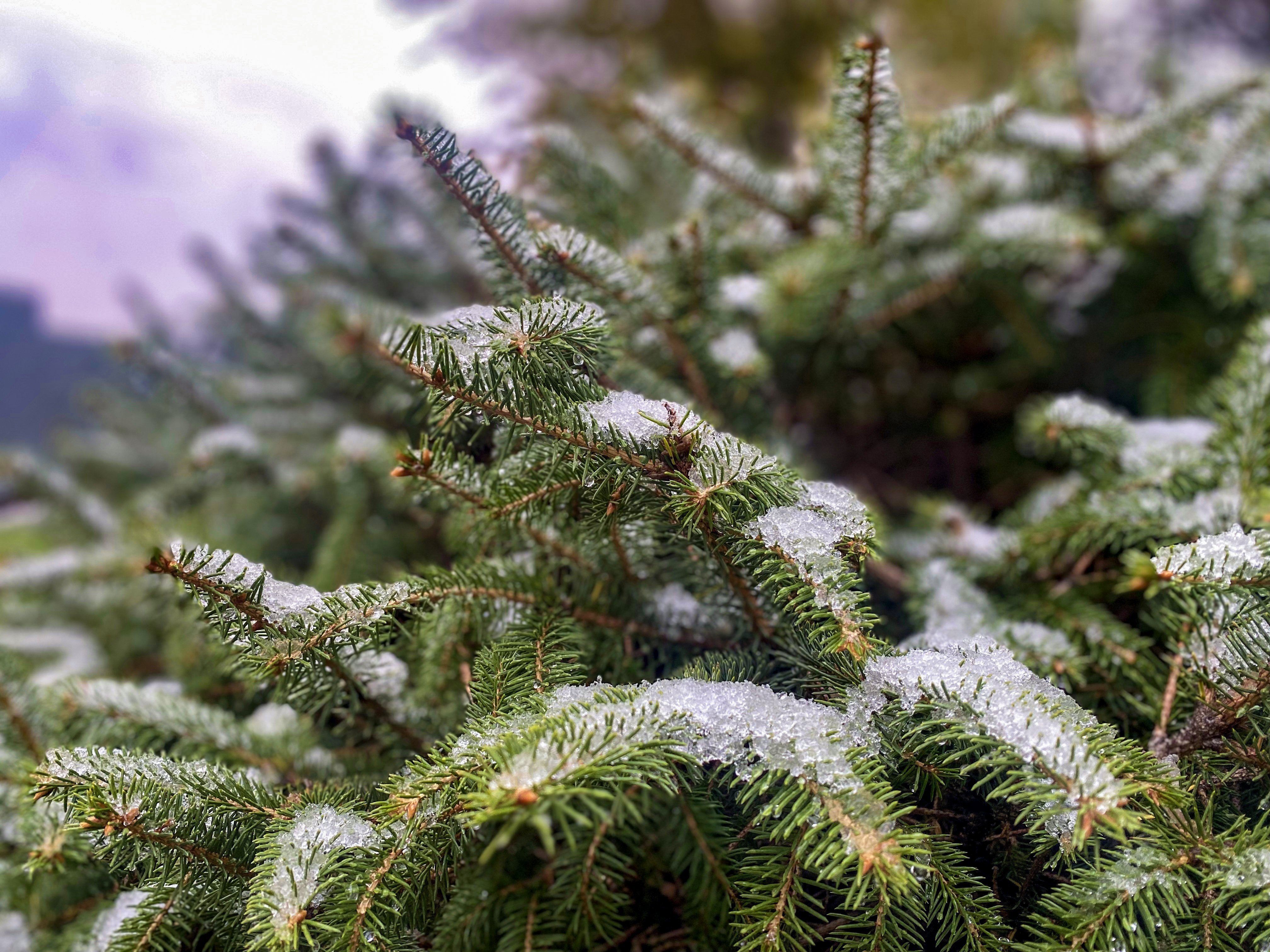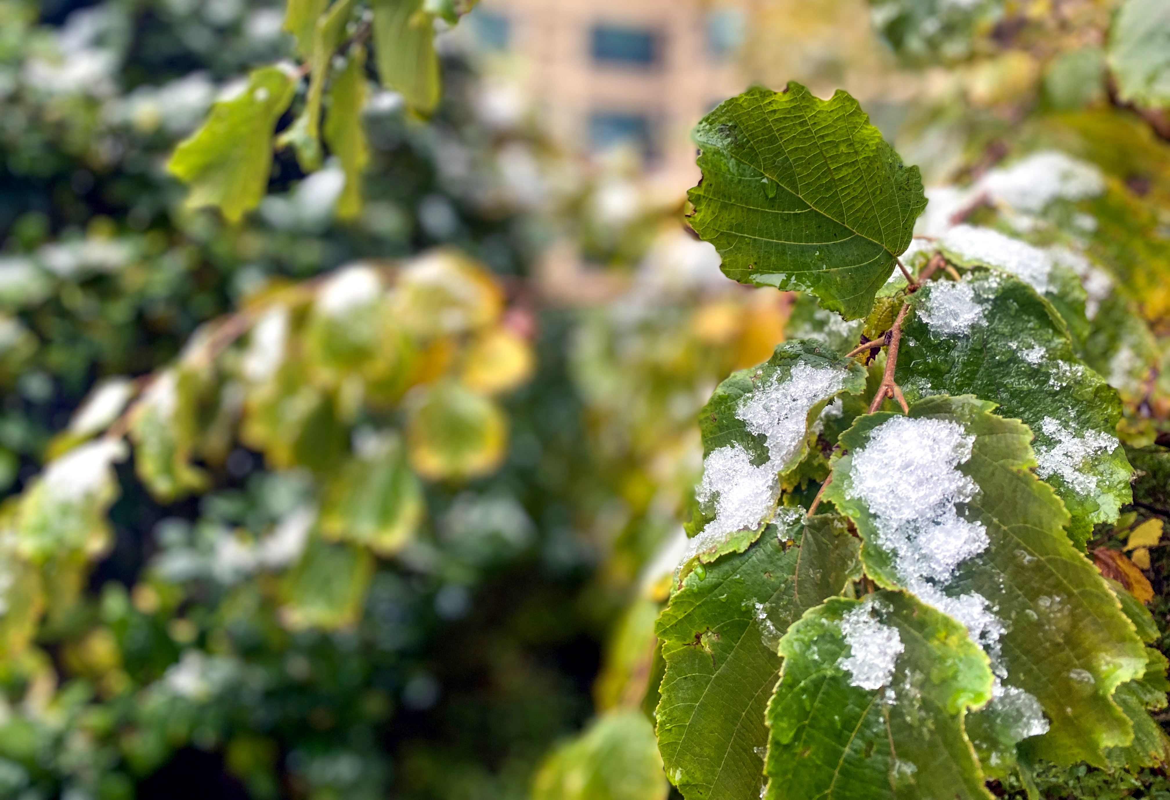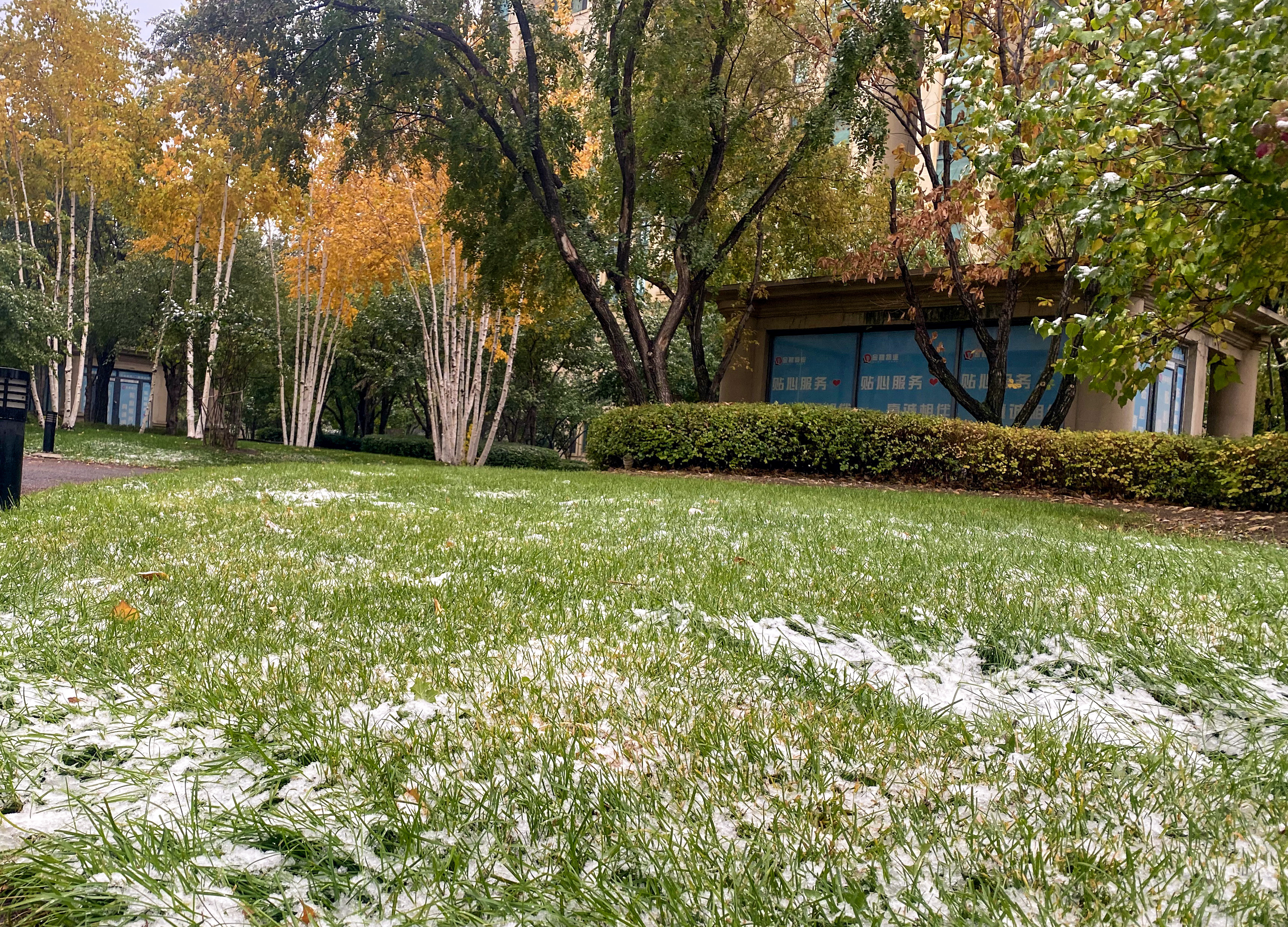 此时,冷、暖空气还在城市里争夺树木间的绿意,很明显,冷占了上风,树叶间的绿意悄悄褪去,赤、橙、黄、绿、紫等色彩开始主宰整个城市。而这第一场轻雪也加入到城市色彩的争夺中去,在城市调色板上觅得自己的一席之地,也悄无声息地告知大家,冬不远了。